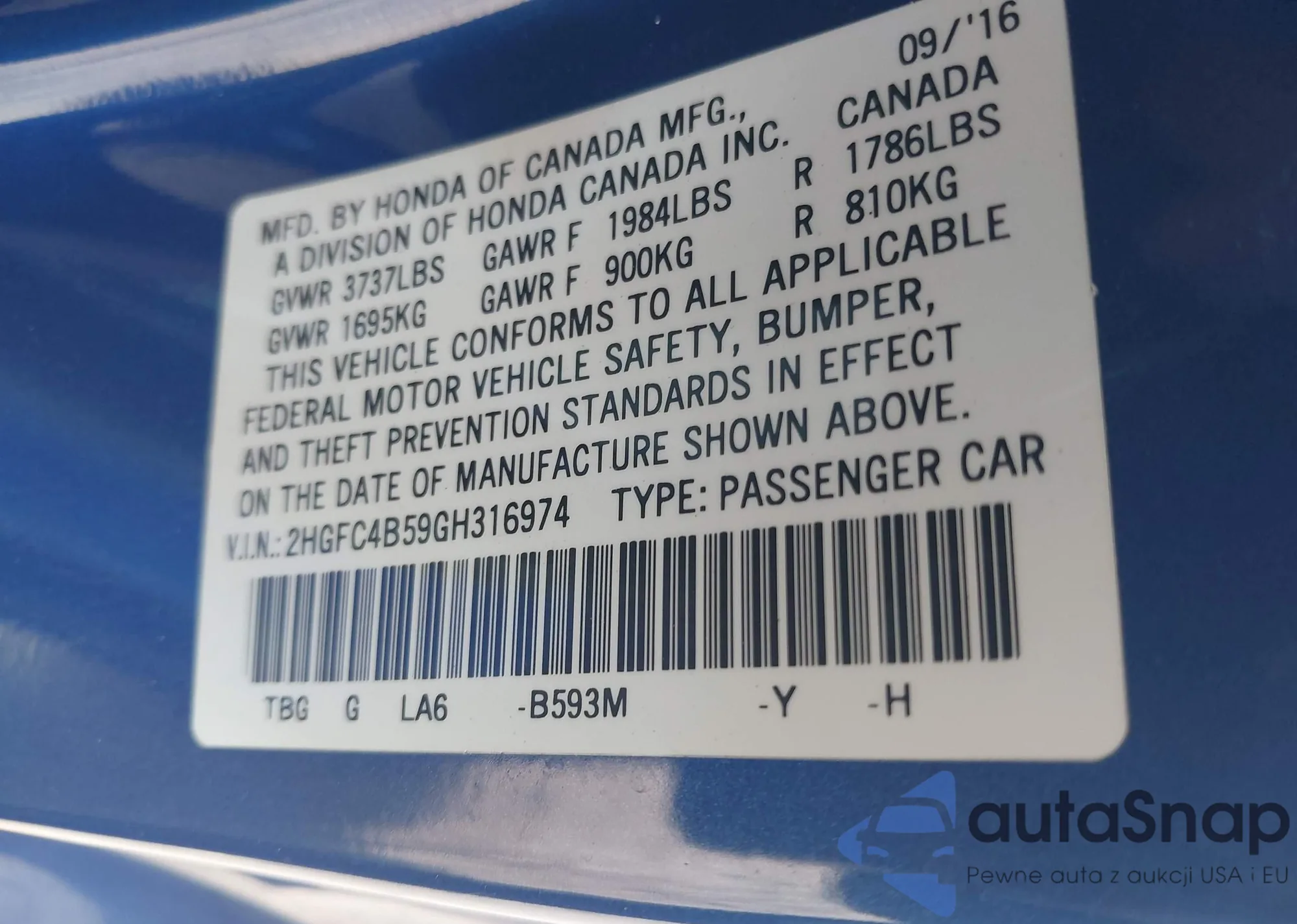 • VIN: 2HGFC4B59GH316974