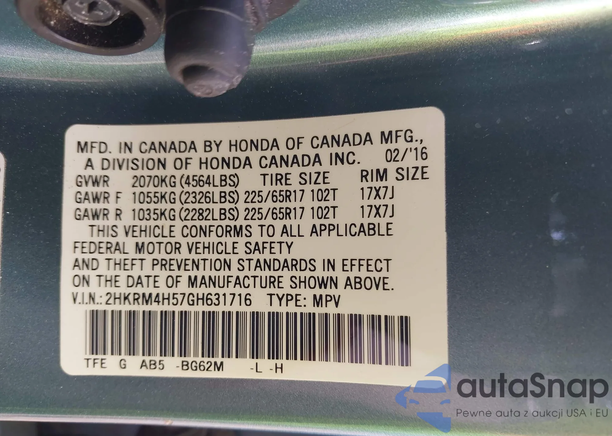 VIN: 2HKRM4H57GH631716