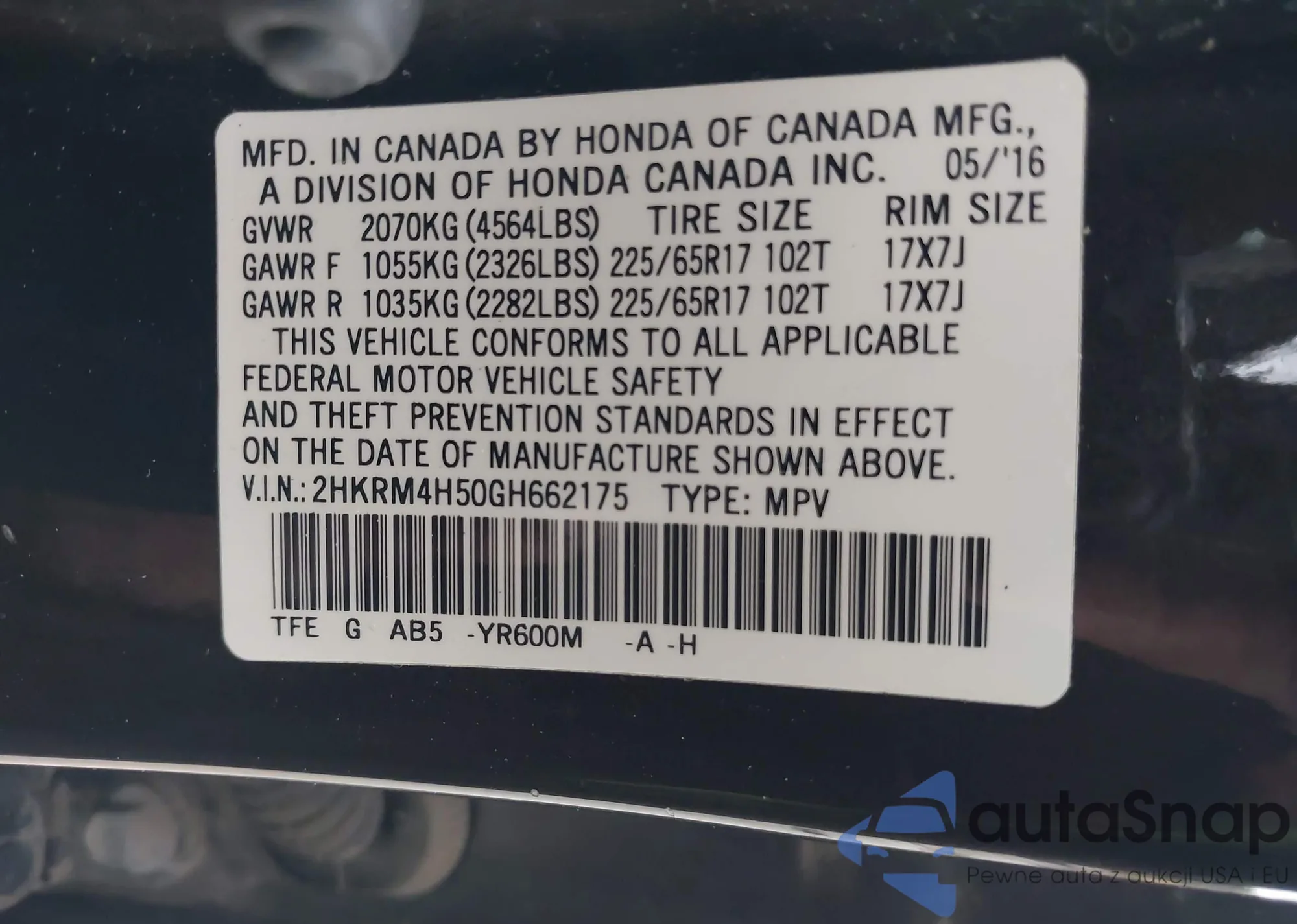 VIN: 2HKRM4H50GH662175