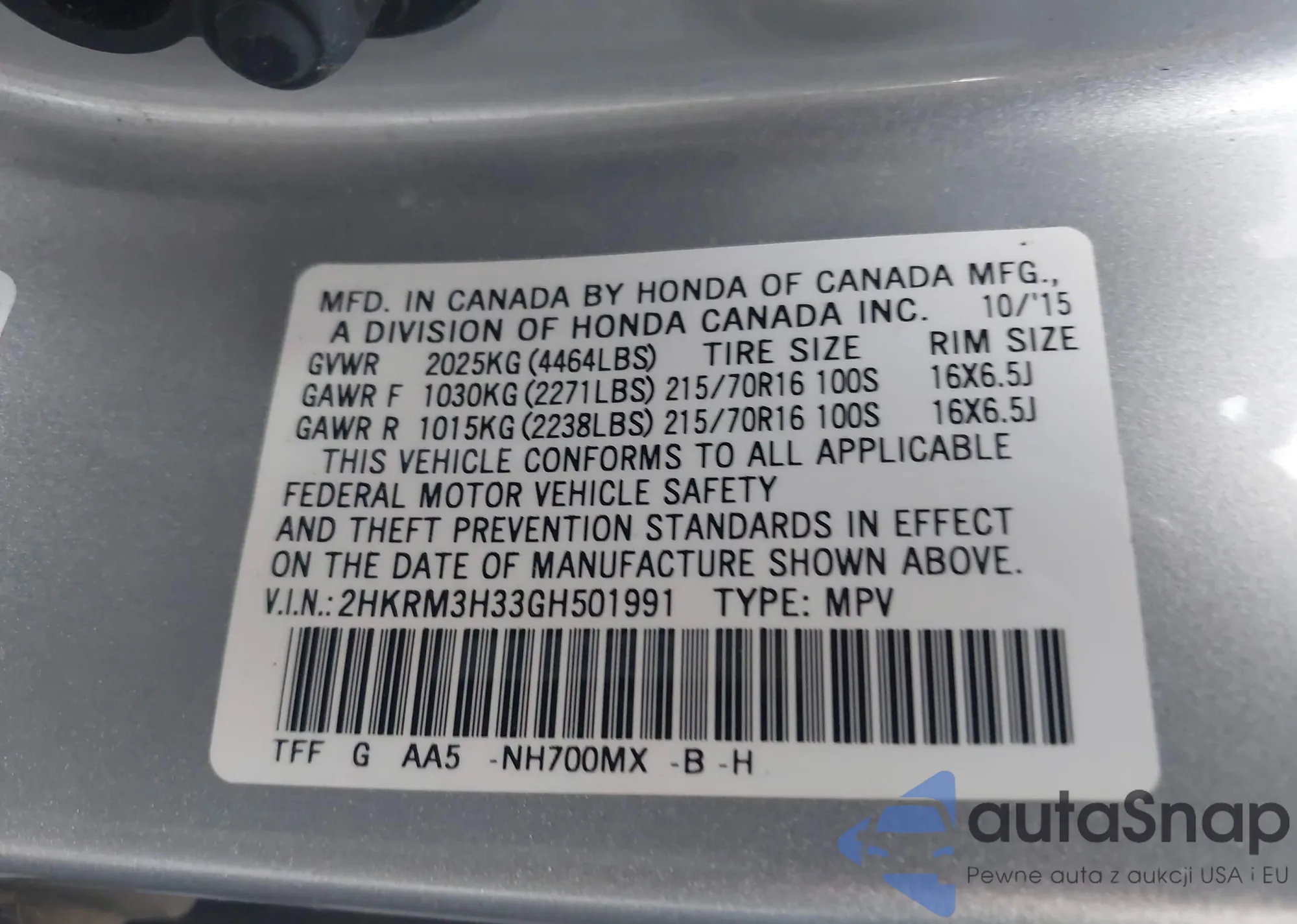 VIN: 2HKRM3H33GH501991