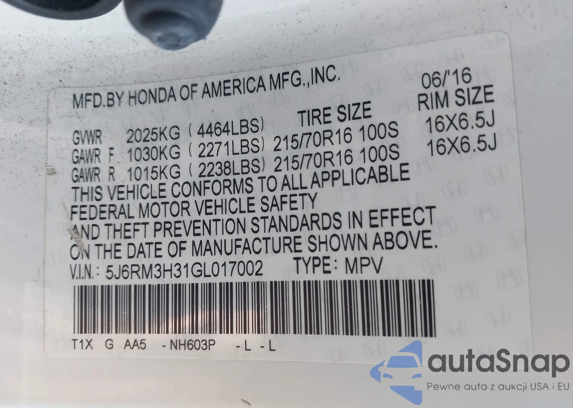 VIN: 5J6RM3H31GL017002