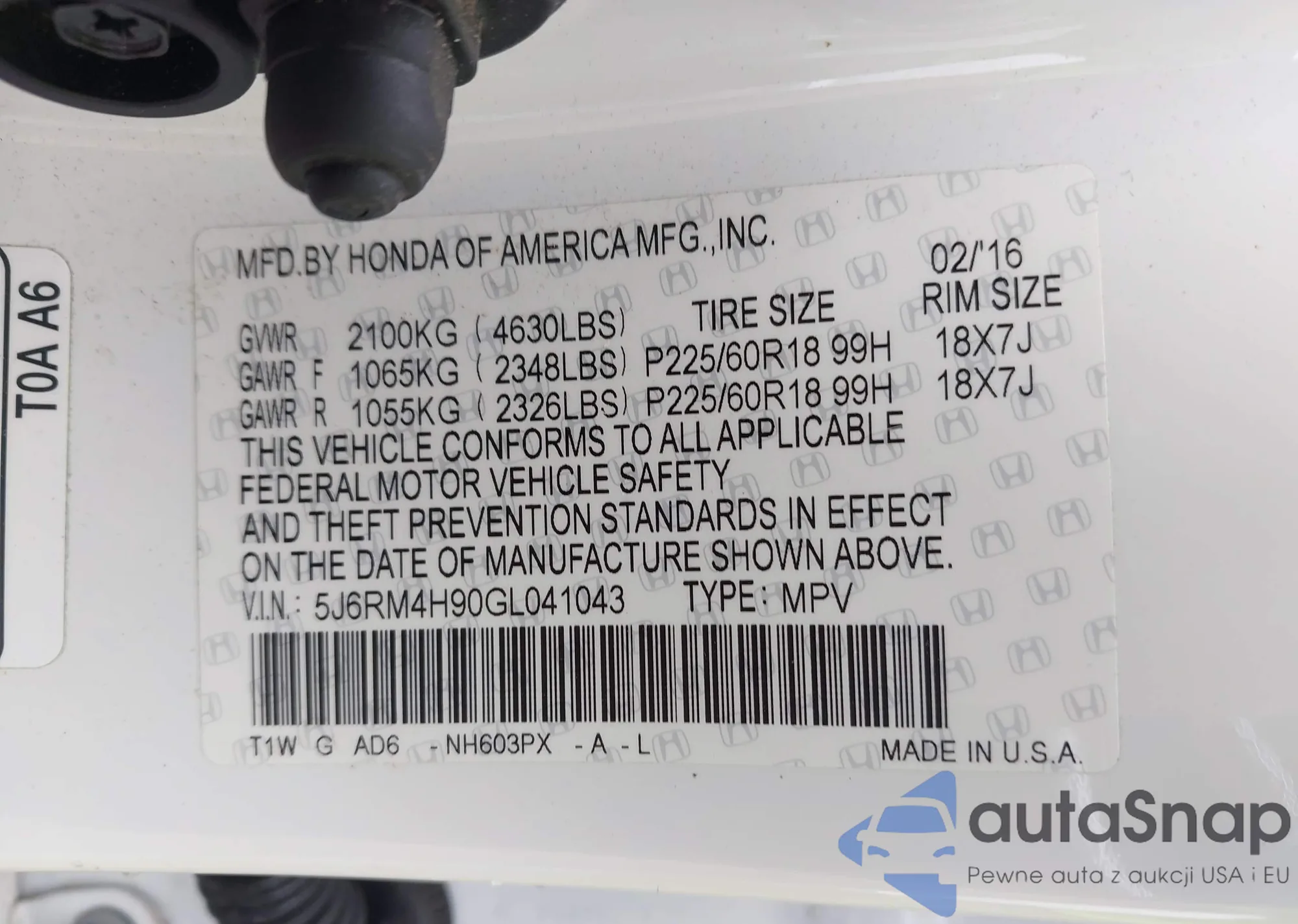 VIN: 5J6RM4H90GL041043