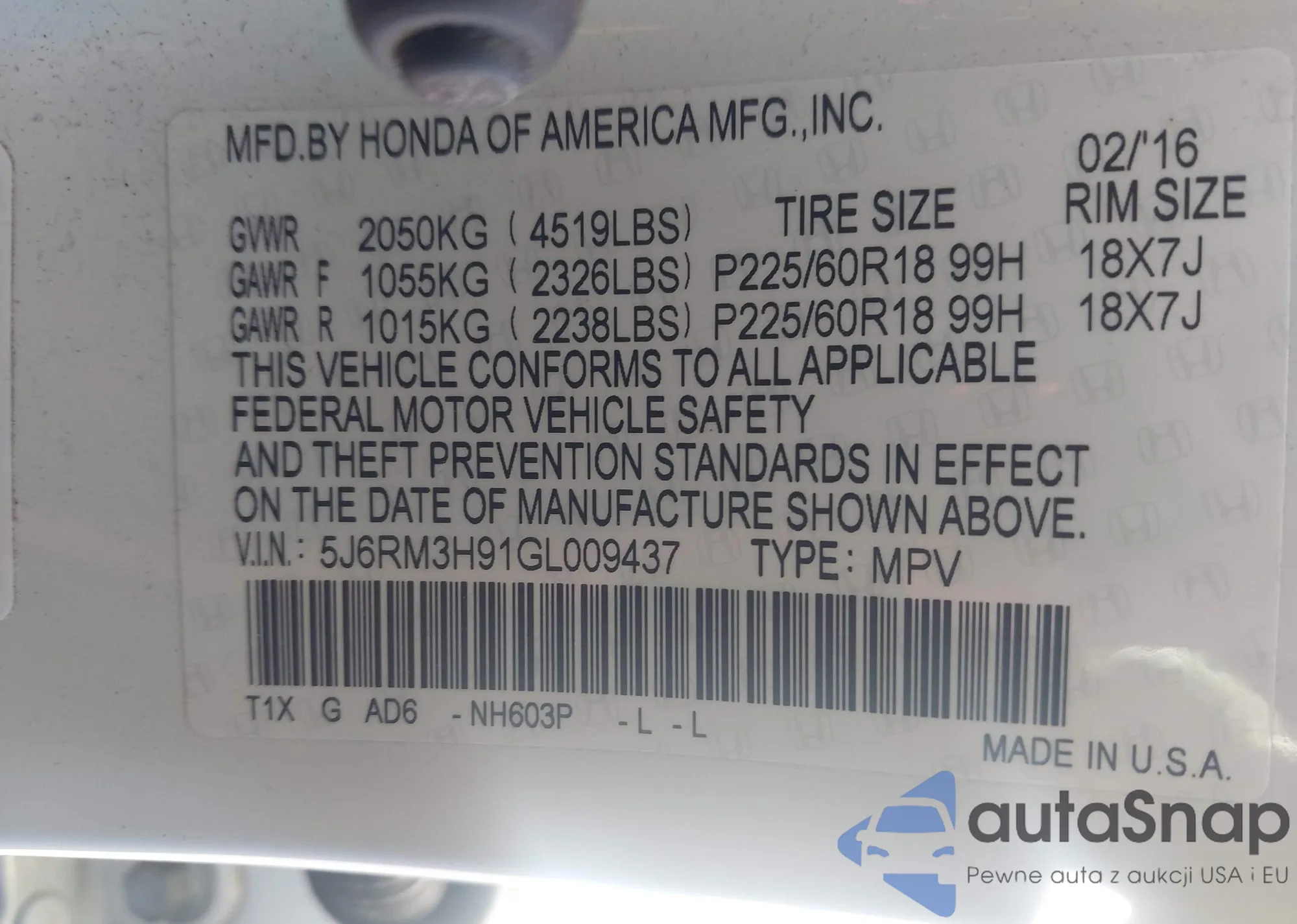 VIN: 5J6RM3H91GL009437