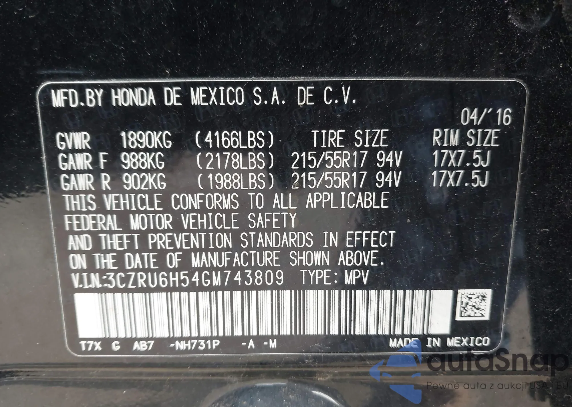 VIN: 3CZRU6H54GM743809