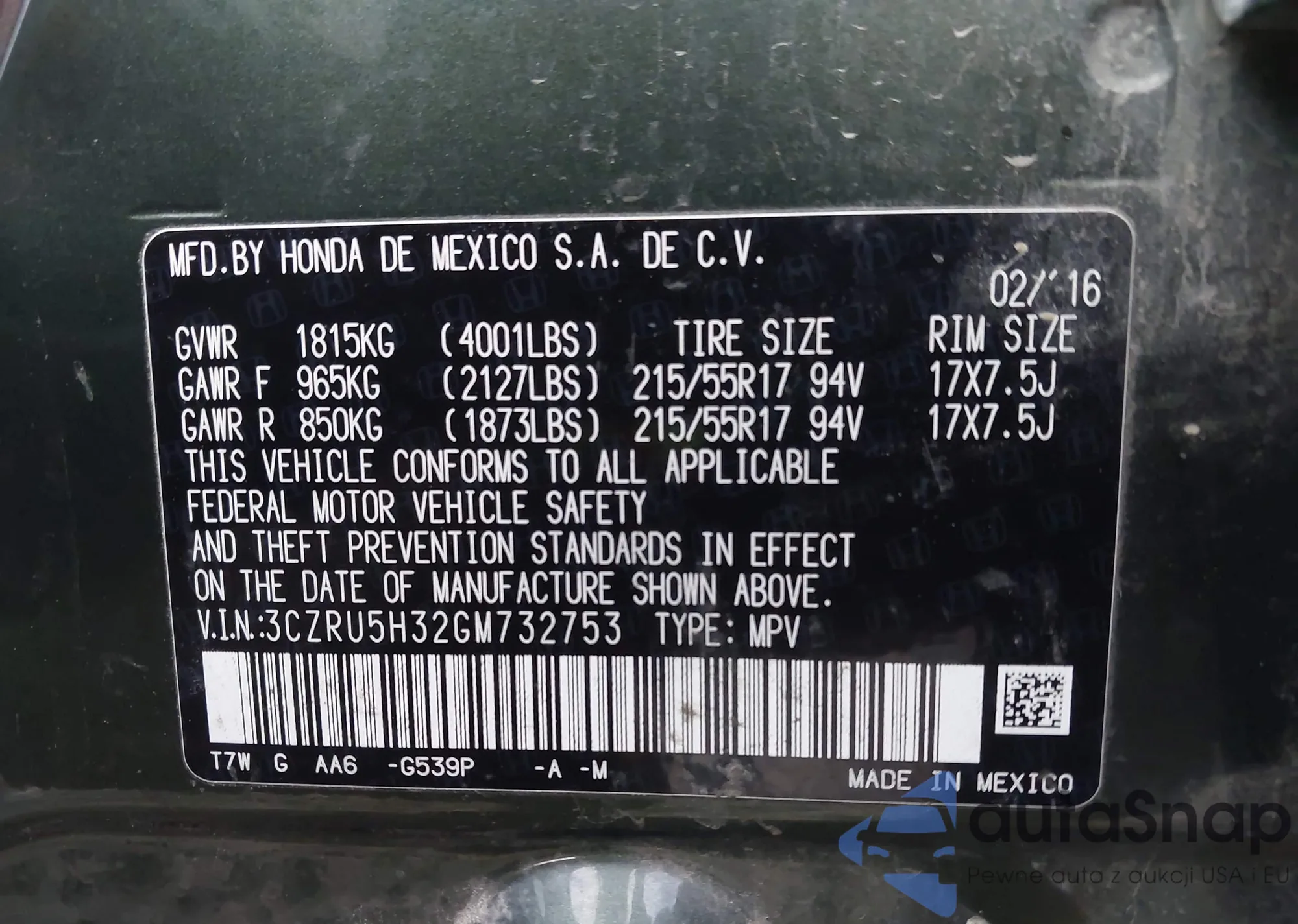The car Honda HR-V 2016 (VIN 3CZRU5H32GM732753) has not been auctioned before. The documents are clean, and the mileage matches or is below the market average. Sold by an insurance company – we recommend purchase. Delivery to the port will take approx. 6–8 weeks.
