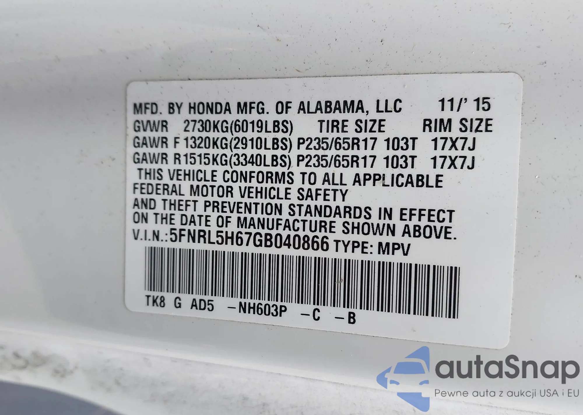 The car Honda Odyssey 2016 (VIN 5FNRL5H67GB040866) has not been auctioned before. The documents are clean, and the mileage matches or is below the market average. Sold by an insurance company – we recommend purchase. Delivery to the port will take approx. 6–8 weeks.