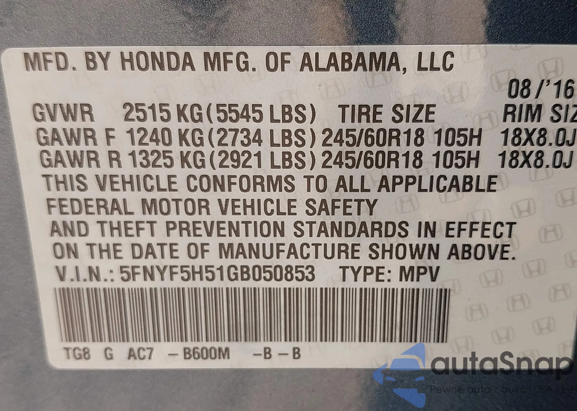 VIN: 5FNYF5H51GB050853