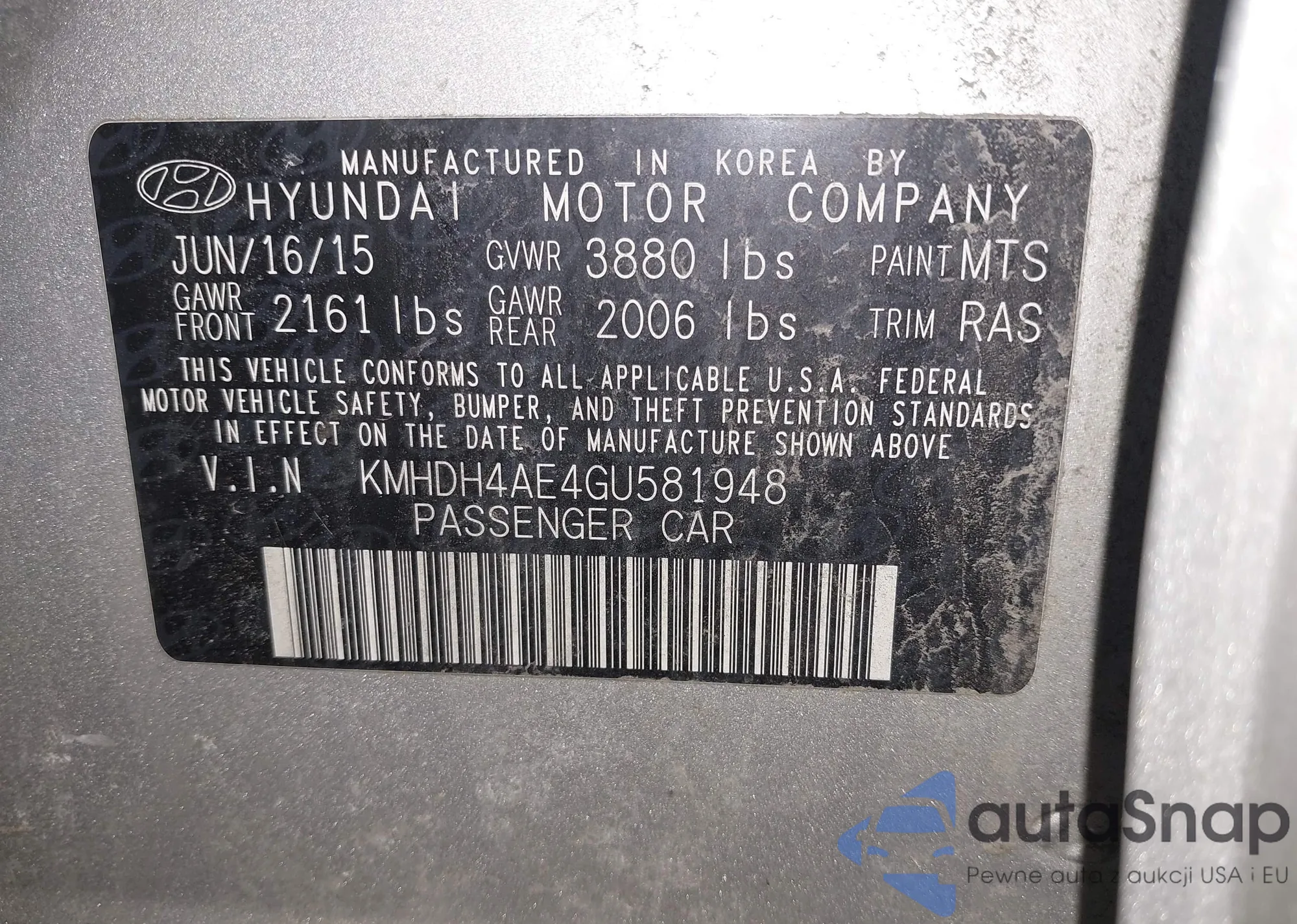 The car Hyundai Elantra 2016 (VIN KMHDH4AE4GU581948) has not been auctioned before. The documents are clean, and the mileage matches or is below the market average. Sold by an insurance company – we recommend purchase. Delivery to the port will take approx. 6–8 weeks.