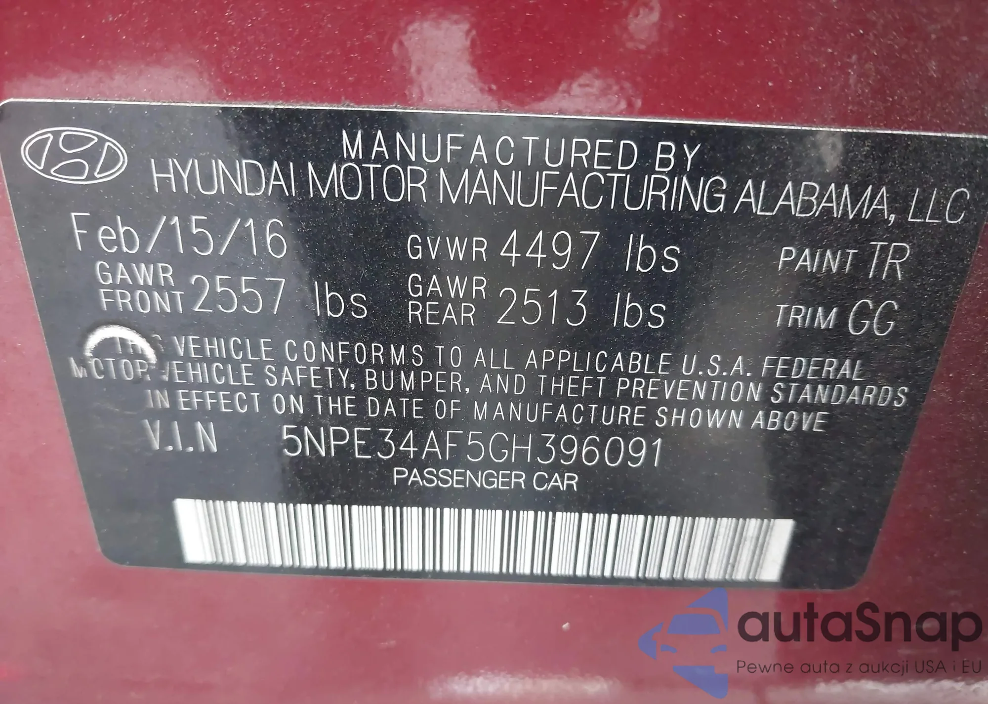 VIN: 5NPE34AF5GH396091