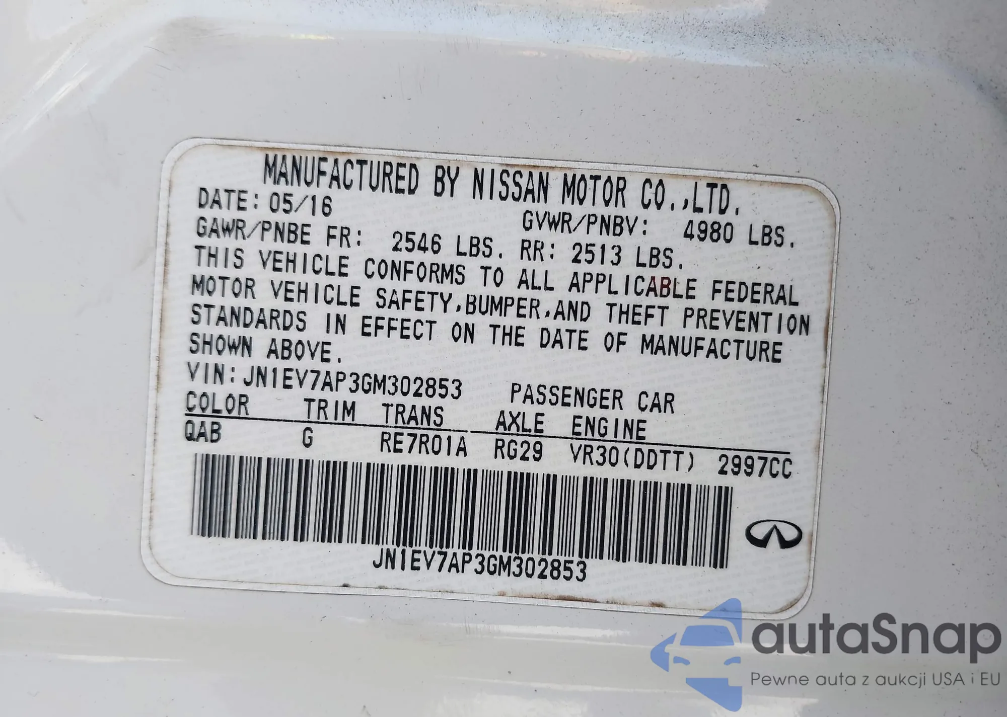 The car Infiniti Q50 2016 (VIN JN1EV7AP3GM302853) has not been auctioned before. The documents are clean, and the mileage matches or is below the market average. Sold by an insurance company – we recommend purchase. Delivery to the port will take approx. 6–8 weeks.