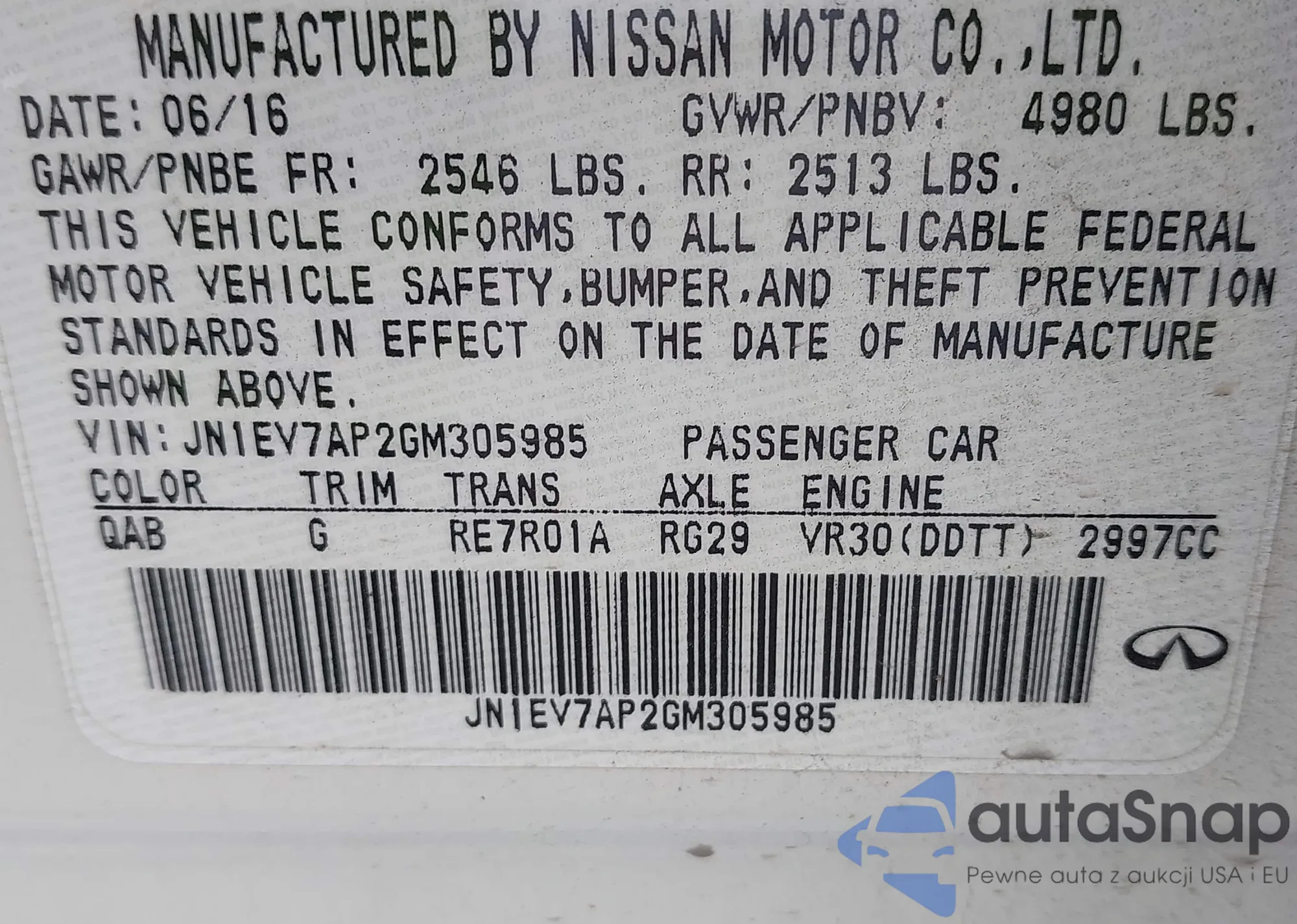 The car Infiniti Q50 2016 (VIN JN1EV7AP2GM305985) is sold by an unverified seller. We recommend checking the Carfax report and confirming registration possibilities before purchase.