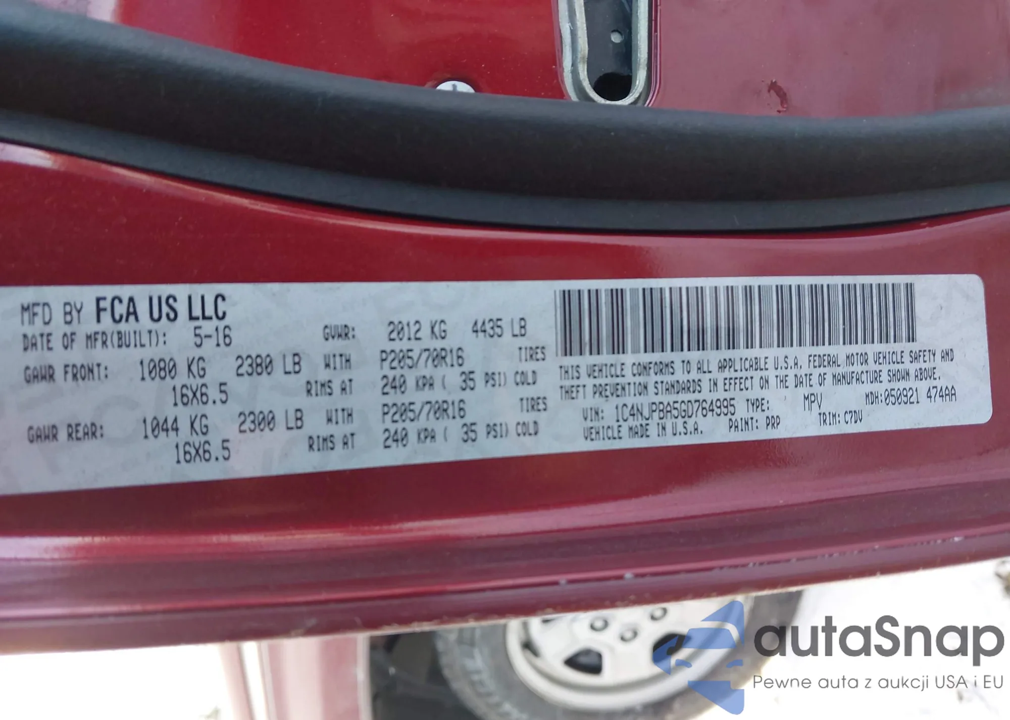 The car Jeep Liberty (Patriot) 2016 (VIN 1C4NJPBA5GD764995) has not been auctioned before. The documents are clean, and the mileage matches or is below the market average. Sold by an insurance company – we recommend purchase. Delivery to the port will take approx. 6–8 weeks.