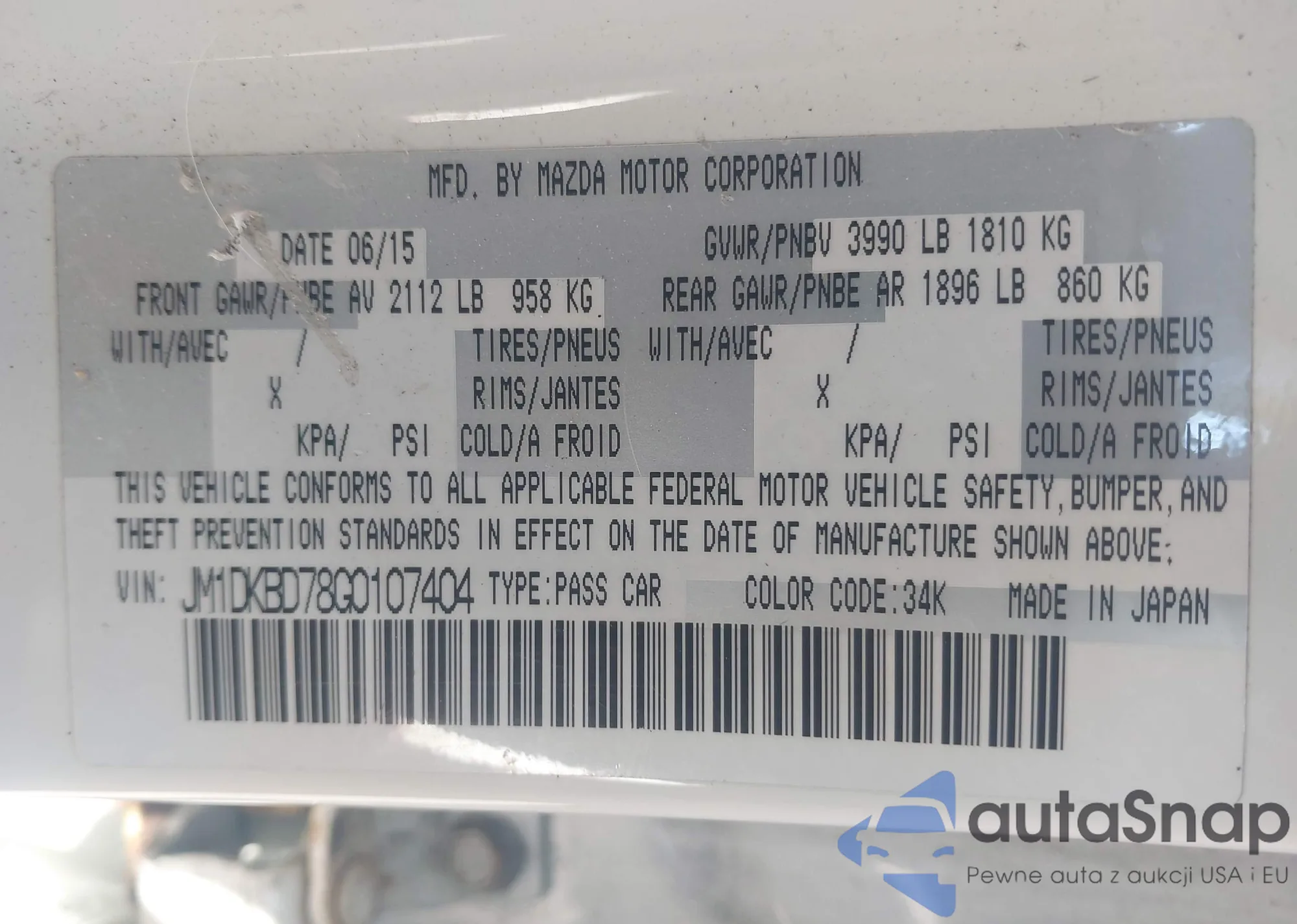The car Mazda CX-3 2016 (VIN JM1DKBD78G0107404) has documents that prevent registration. Export and registration may be difficult. Contact AutaSnap experts to find alternatives.