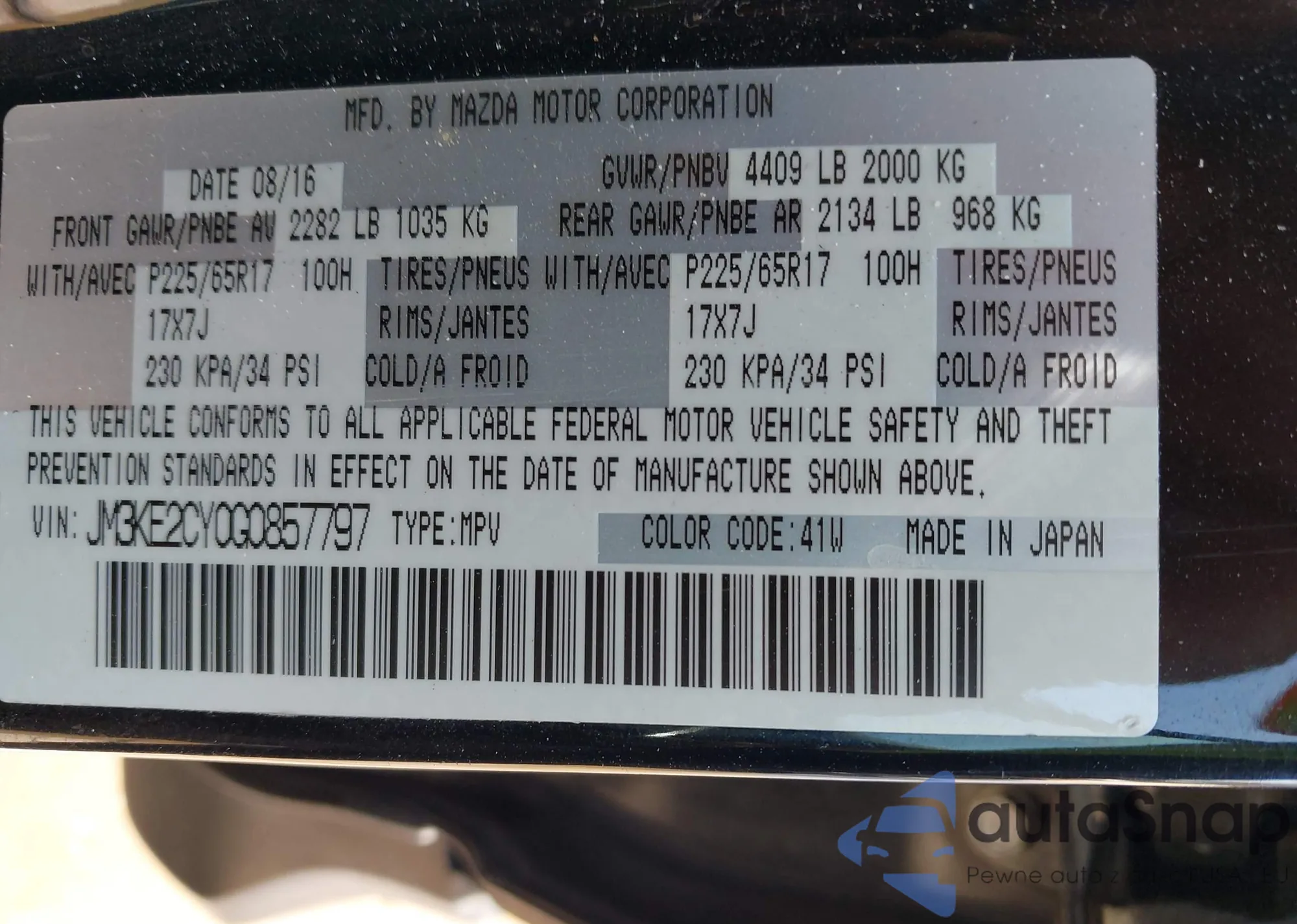 The car Mazda CX-5 2016 (VIN JM3KE2CY0G0857797) has not been auctioned before. The documents are clean, and the mileage matches or is below the market average. Sold by an insurance company – we recommend purchase. Delivery to the port will take approx. 6–8 weeks.
