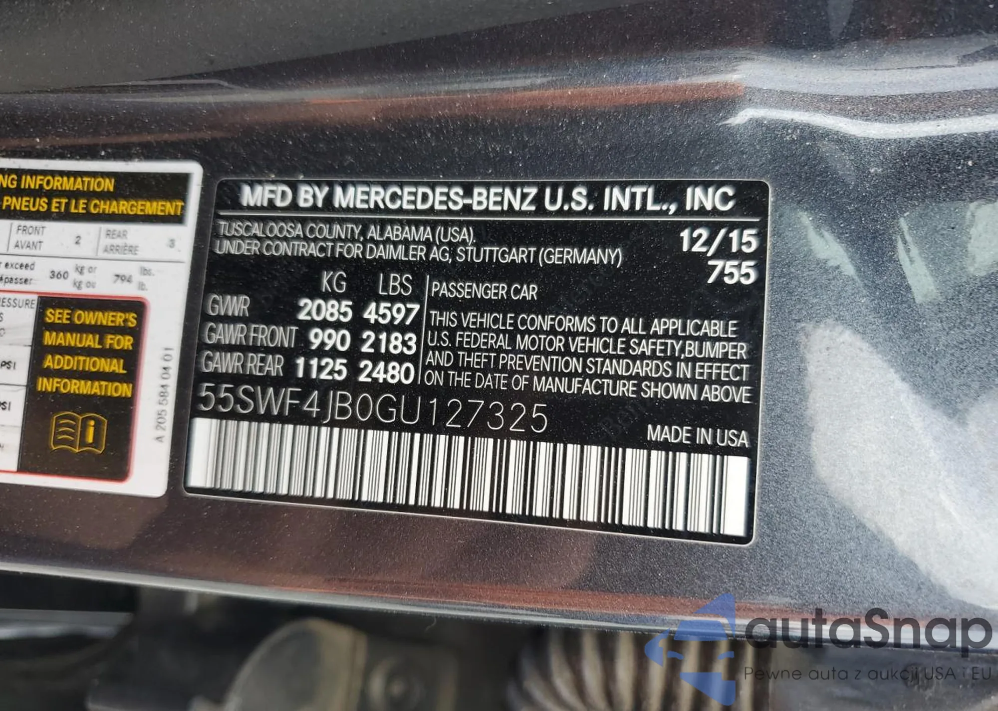 The car Mercedes-Benz C-klasse 2016 (VIN 55SWF4JB0GU127325) has documents that prevent registration. Export and registration may be difficult. Contact AutaSnap experts to find alternatives.