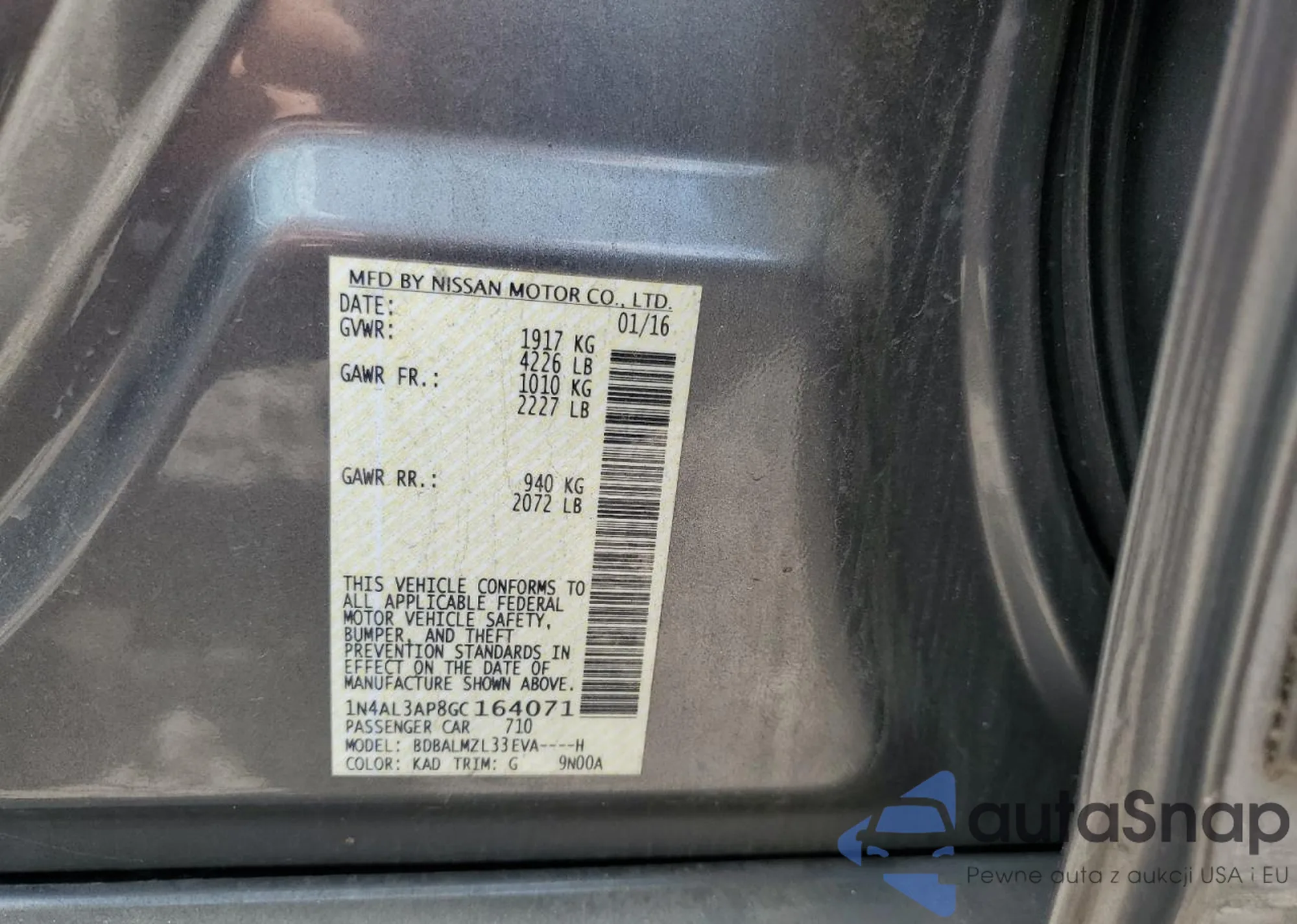 Nissan Altima 2016 – Vehicle History (Sold at COPART)