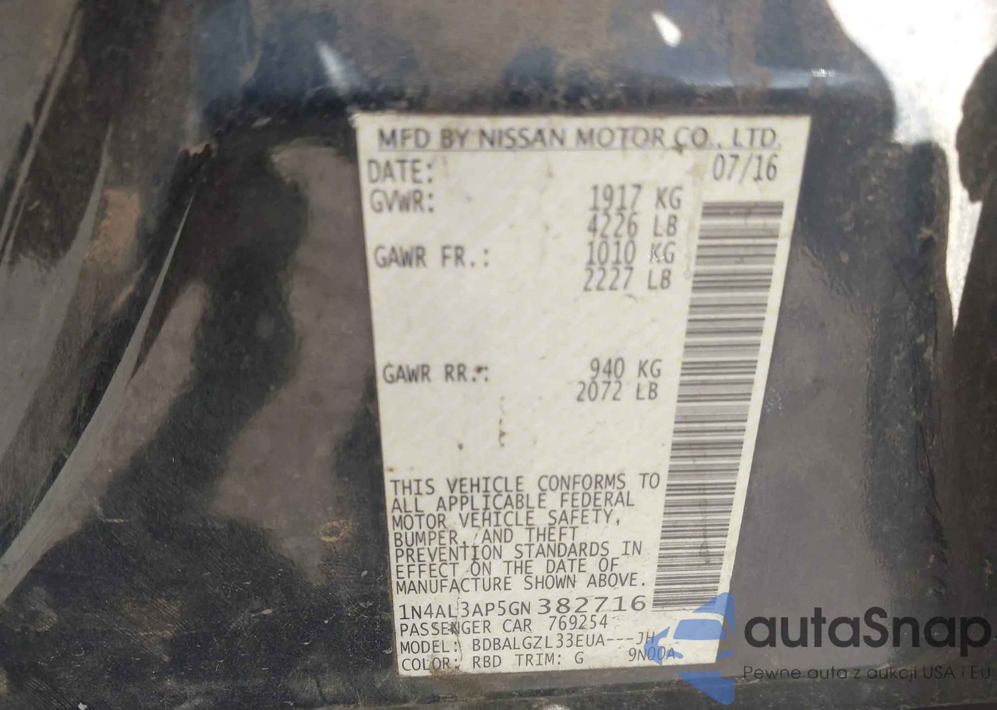 The car Nissan Altima 2016 (VIN 1N4AL3AP5GN382716) has not been auctioned before. The documents are clean, and the mileage matches or is below the market average. Sold by an insurance company – we recommend purchase. Delivery to the port will take approx. 6–8 weeks.