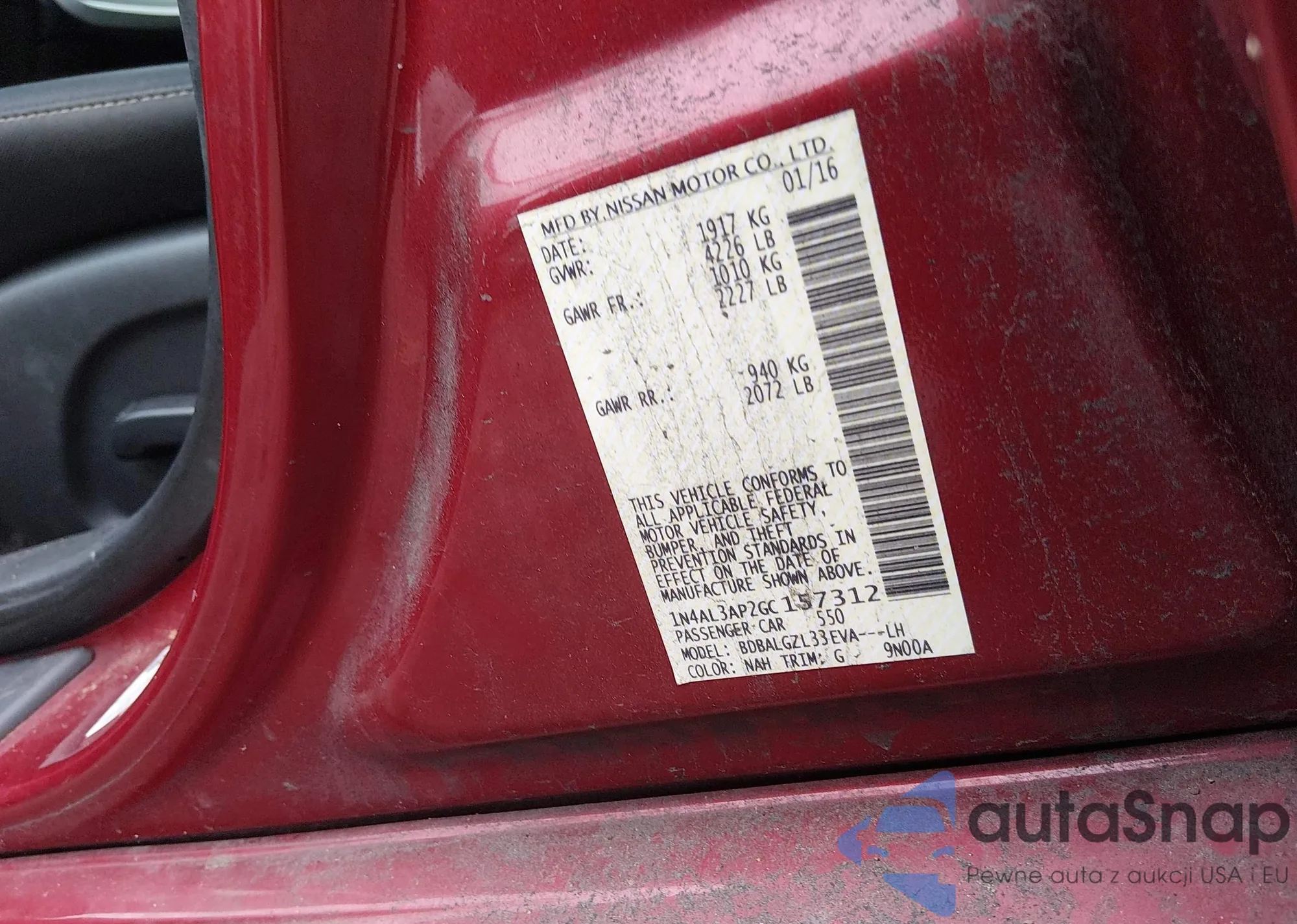 The car Nissan Altima 2016 (VIN 1N4AL3AP2GC157312) has not been auctioned before. The documents are clean, and the mileage matches or is below the market average. Sold by an insurance company – we recommend purchase. Delivery to the port will take approx. 6–8 weeks.