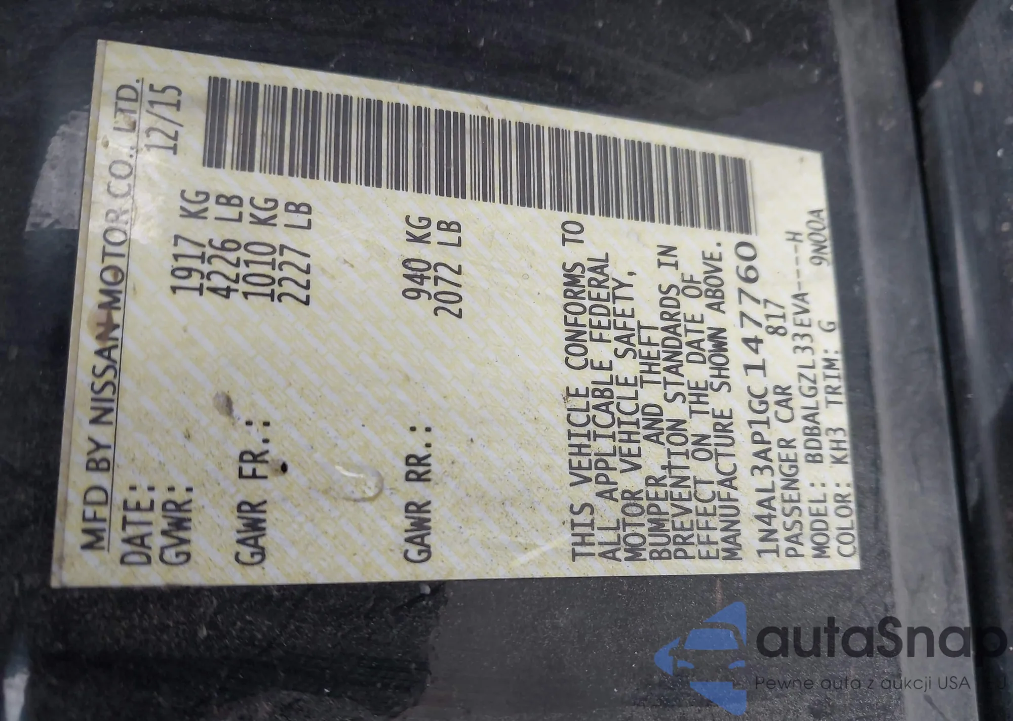 The car Nissan Altima 2016 (VIN 1N4AL3AP1GC147760) has not been auctioned before. The documents are clean, and the mileage matches or is below the market average. Sold by an insurance company – we recommend purchase. Delivery to the port will take approx. 6–8 weeks.