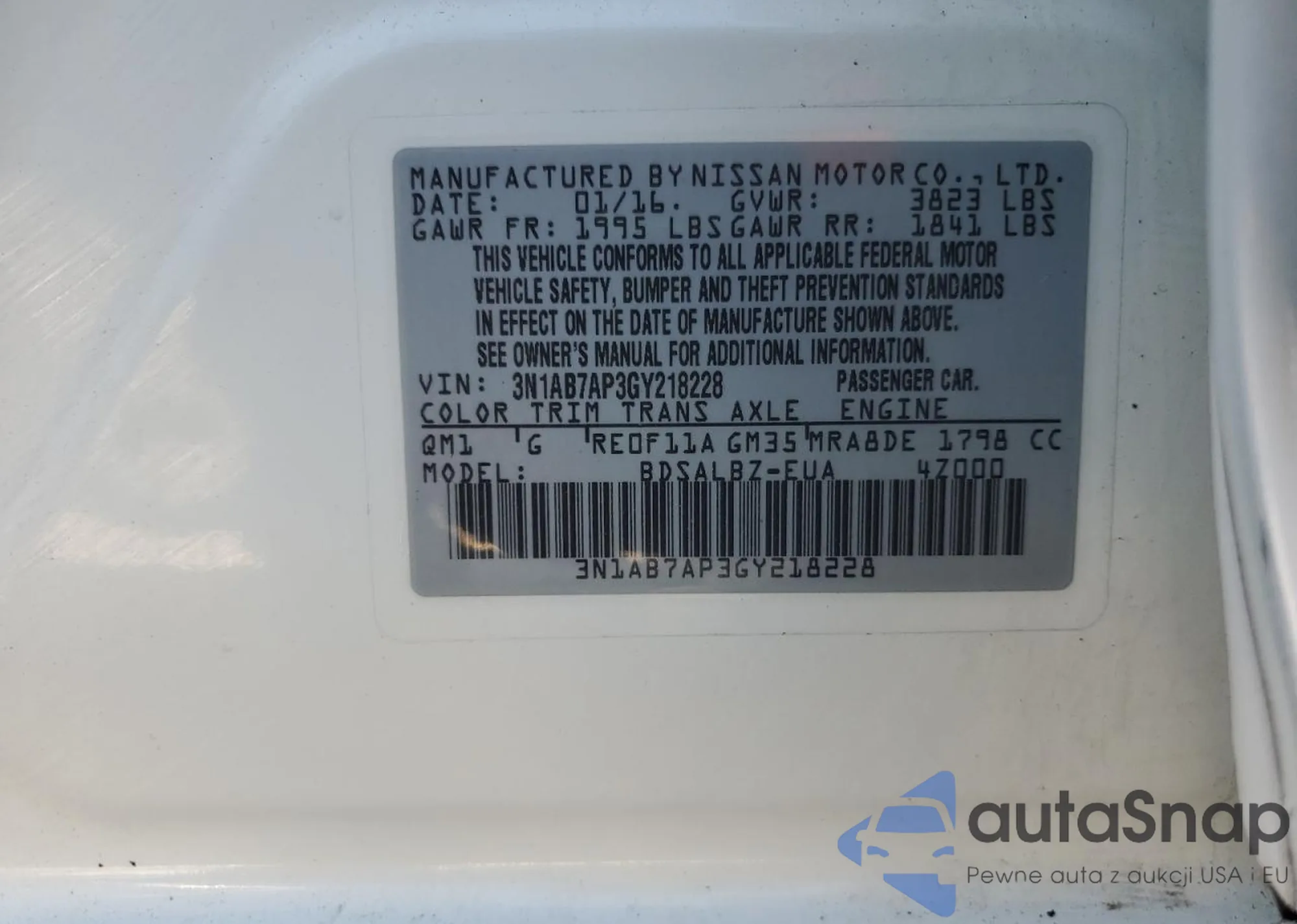 The car Nissan Sentra 2016 (VIN 3N1AB7AP3GY218228) has already been auctioned 0 times or is sold by an unverified seller. We recommend checking the Carfax report and confirming registration possibilities before purchase.