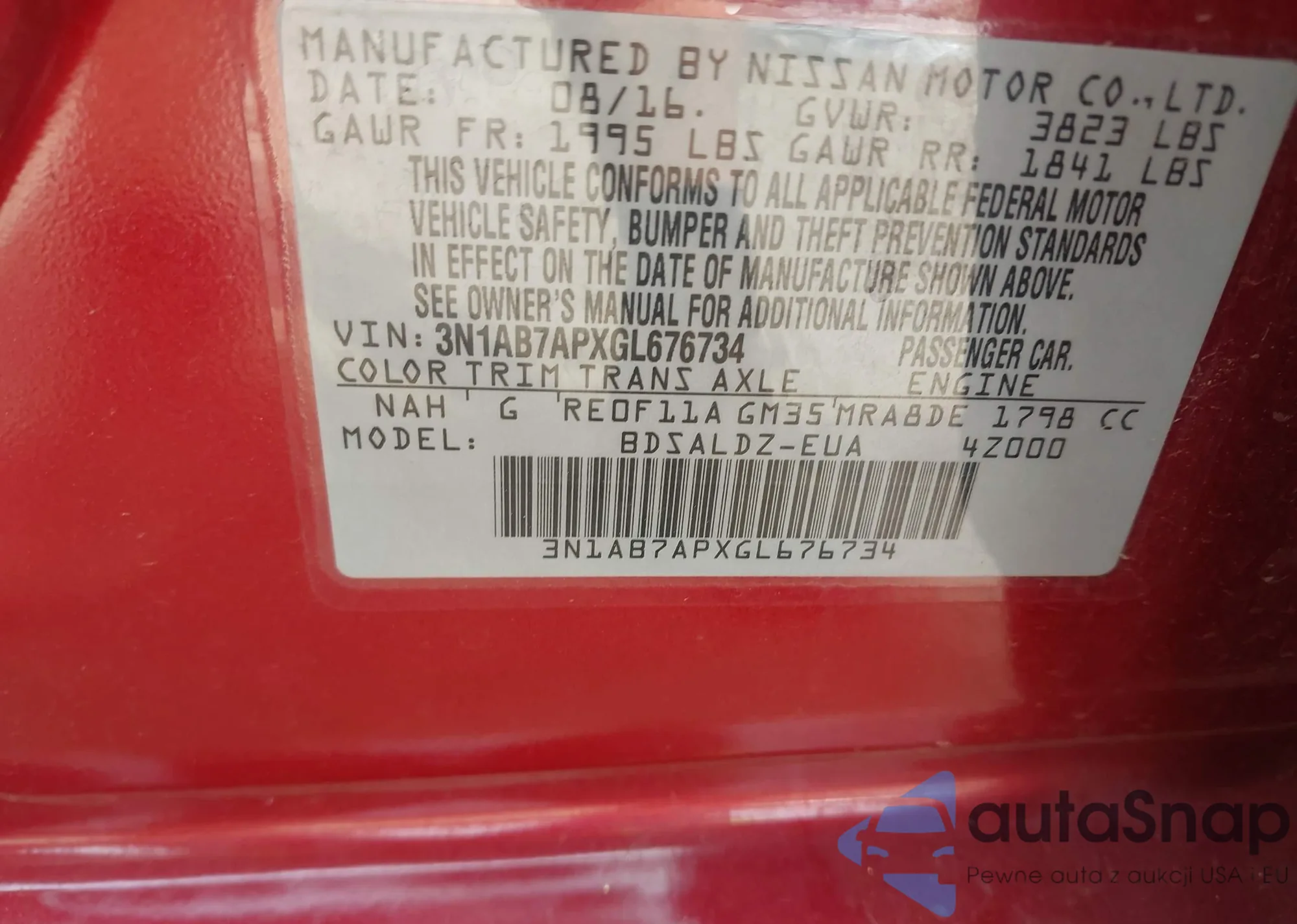 The car Nissan Sentra 2016 (VIN 3N1AB7APXGL676734) has not been auctioned before. The documents are clean, and the mileage matches or is below the market average. Sold by an insurance company – we recommend purchase. Delivery to the port will take approx. 6–8 weeks.