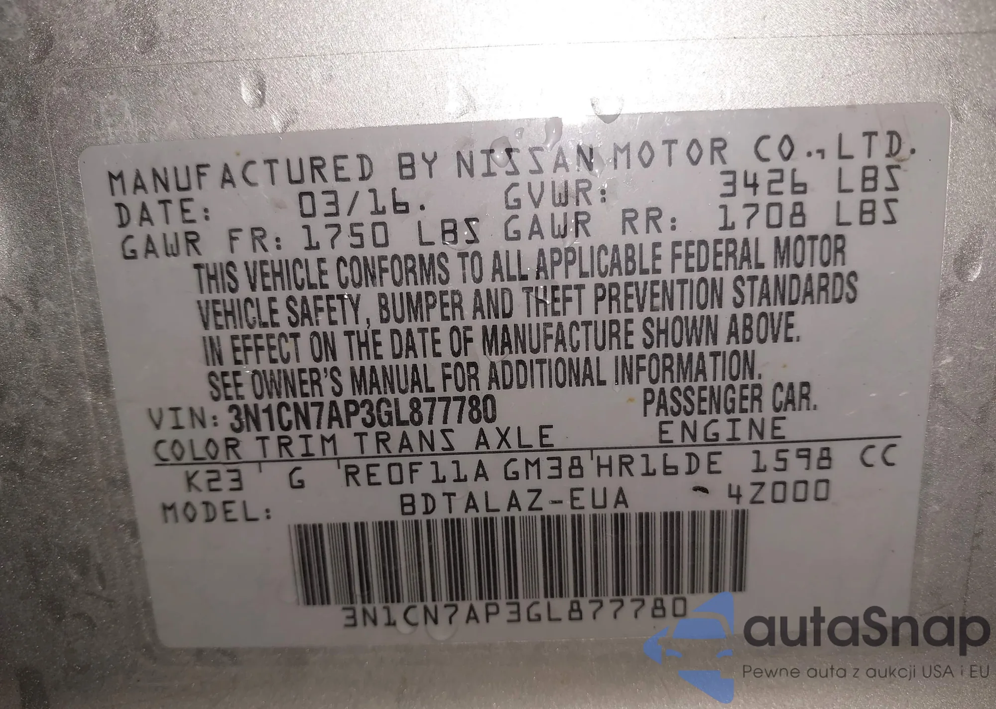 VIN: 3N1CN7AP3GL877780
