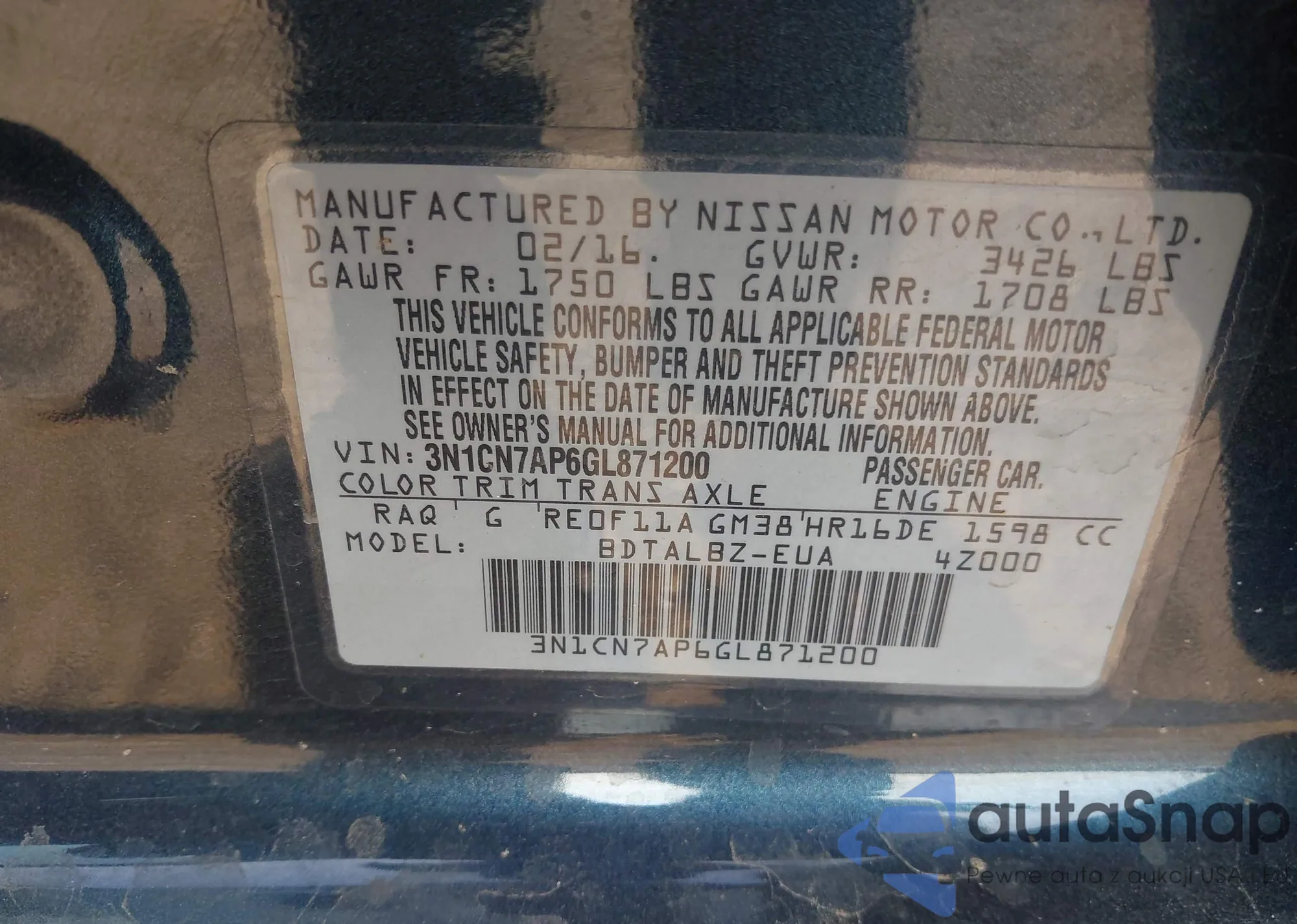 The car Nissan Versa 2016 (VIN 3N1CN7AP6GL871200) has not been auctioned before. The documents are clean, and the mileage matches or is below the market average. Sold by an insurance company – we recommend purchase. Delivery to the port will take approx. 6–8 weeks.