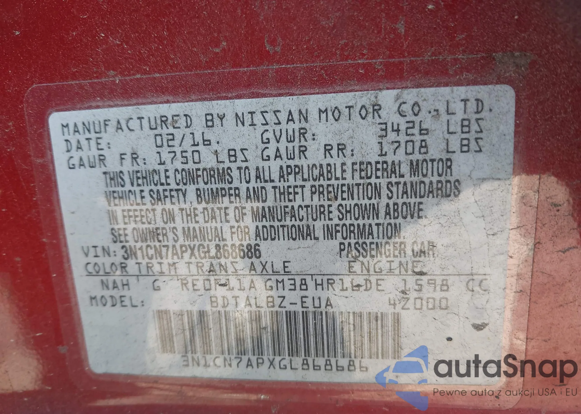 VIN: 3N1CN7APXGL868686