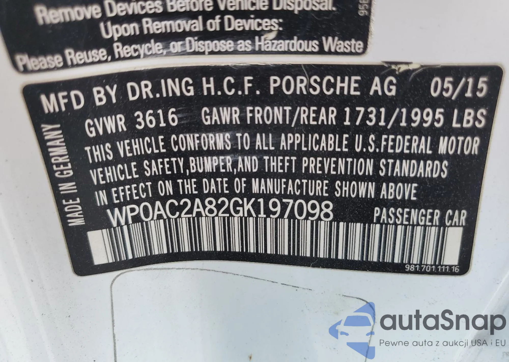 The car Porsche Cayman 2016 (VIN WP0AC2A82GK197098) has already been auctioned 2 times and/or is sold by an unverified seller. We recommend checking the Carfax report and confirming registration possibilities before purchase.