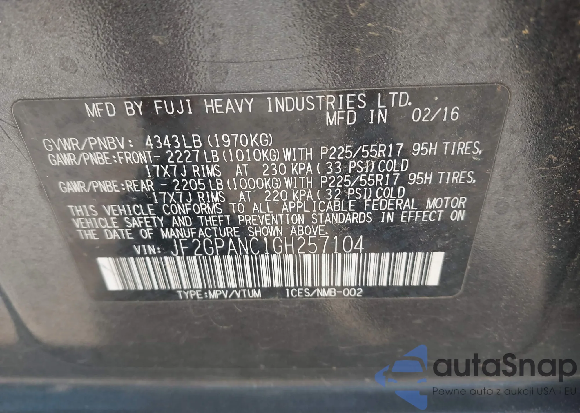 • VIN: JF2GPANC1GH257104
