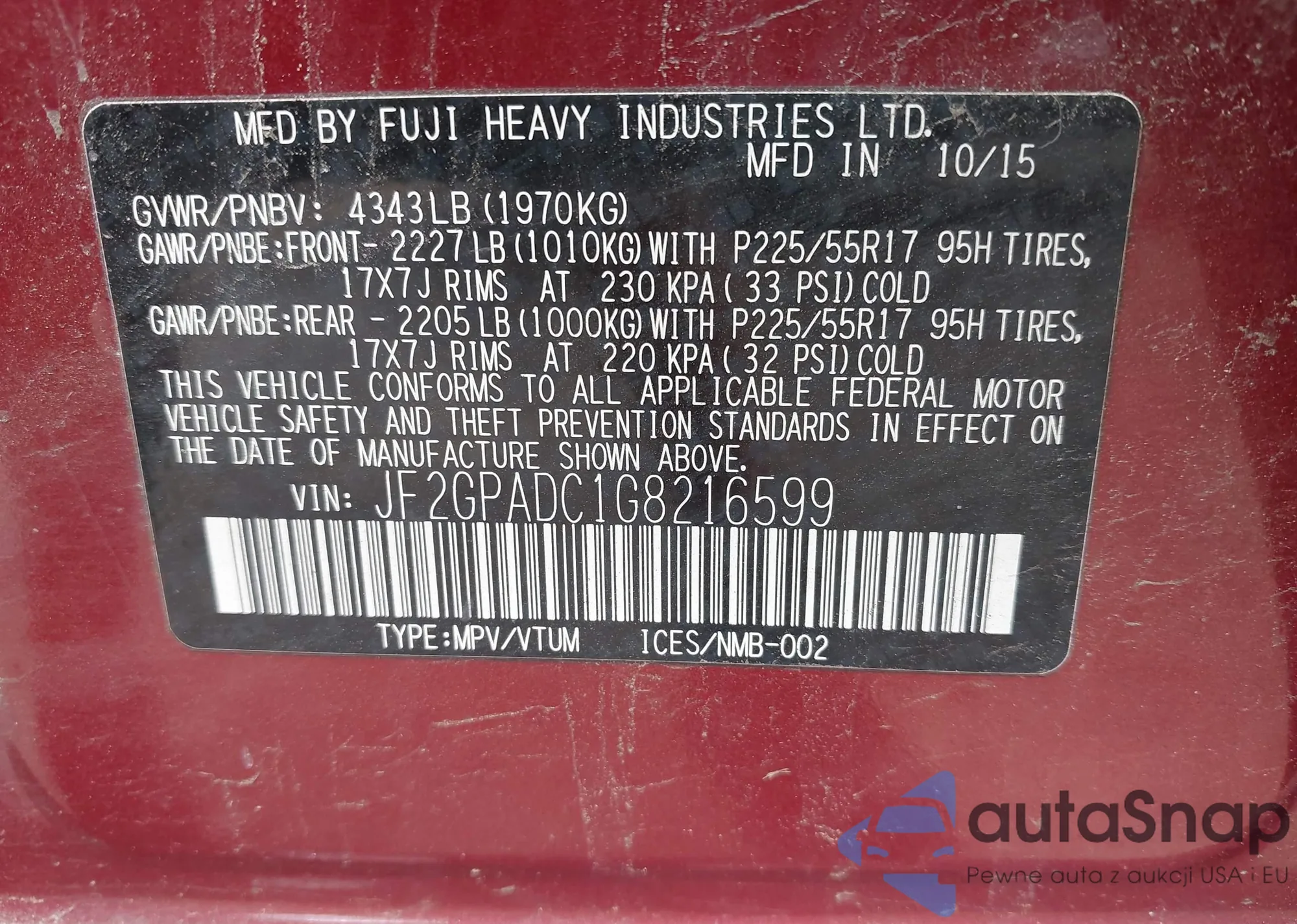 VIN: JF2GPADC1G8216599