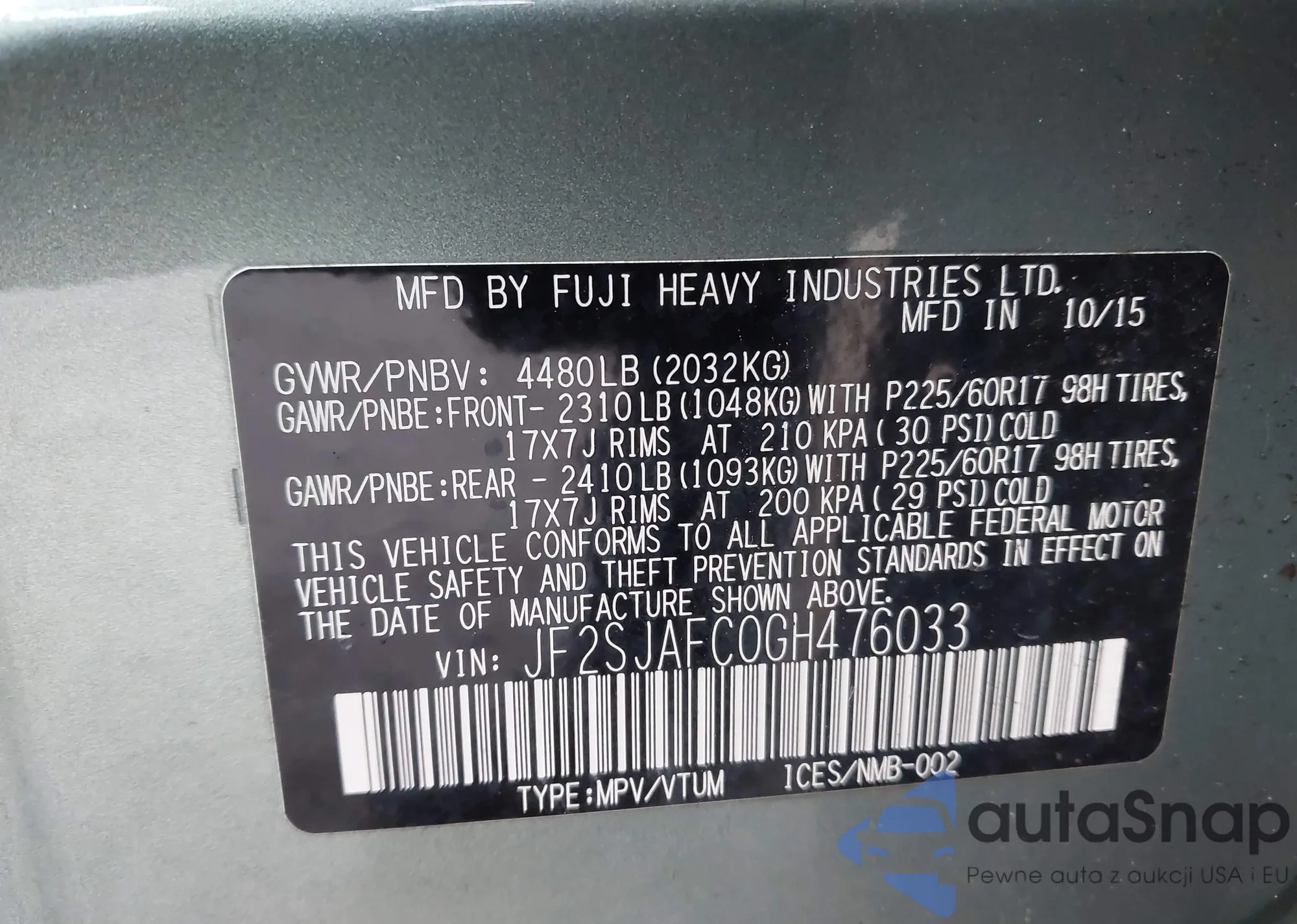 VIN: JF2SJAFC0GH476033