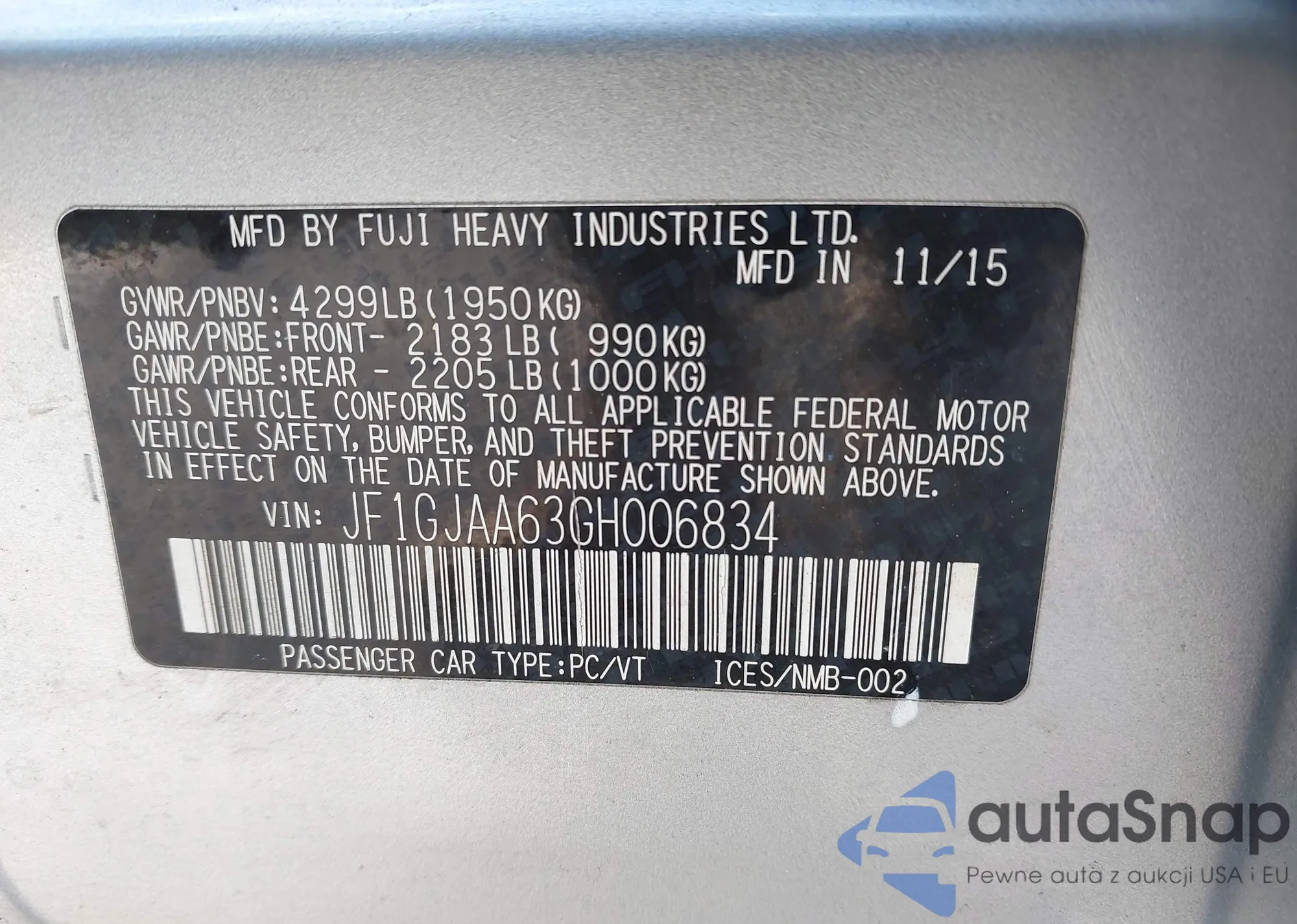 The car Subaru Impreza 2016 (VIN JF1GJAA63GH006834) has not been auctioned before. The documents are clean, and the mileage matches or is below the market average. Sold by an insurance company – we recommend purchase. Delivery to the port will take approx. 6–8 weeks.