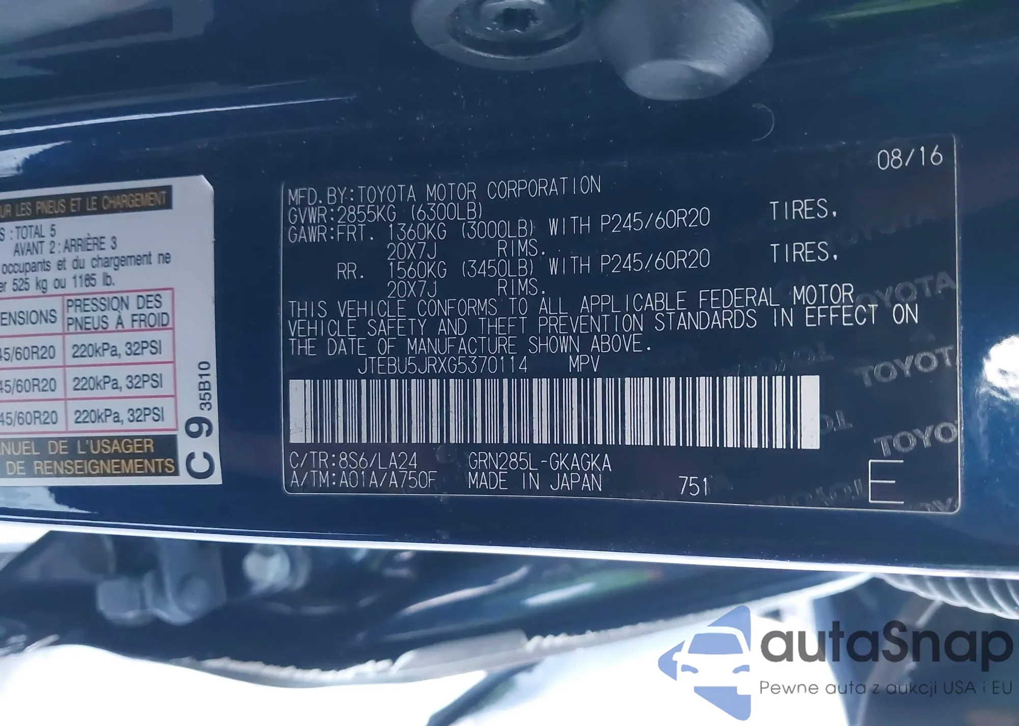 The car Toyota 4Runner 2016 (VIN JTEBU5JRXG5370114) has not been auctioned before. The documents are clean, and the mileage matches or is below the market average. Sold by an insurance company – we recommend purchase. Delivery to the port will take approx. 6–8 weeks.