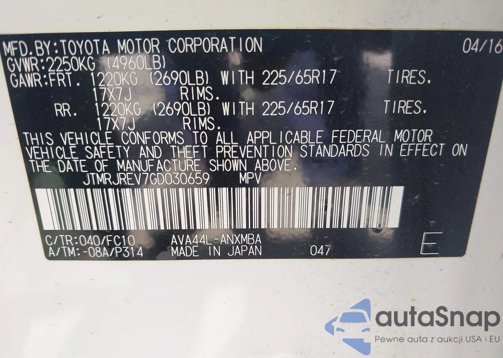 VIN: JTMRJREV7GD030659