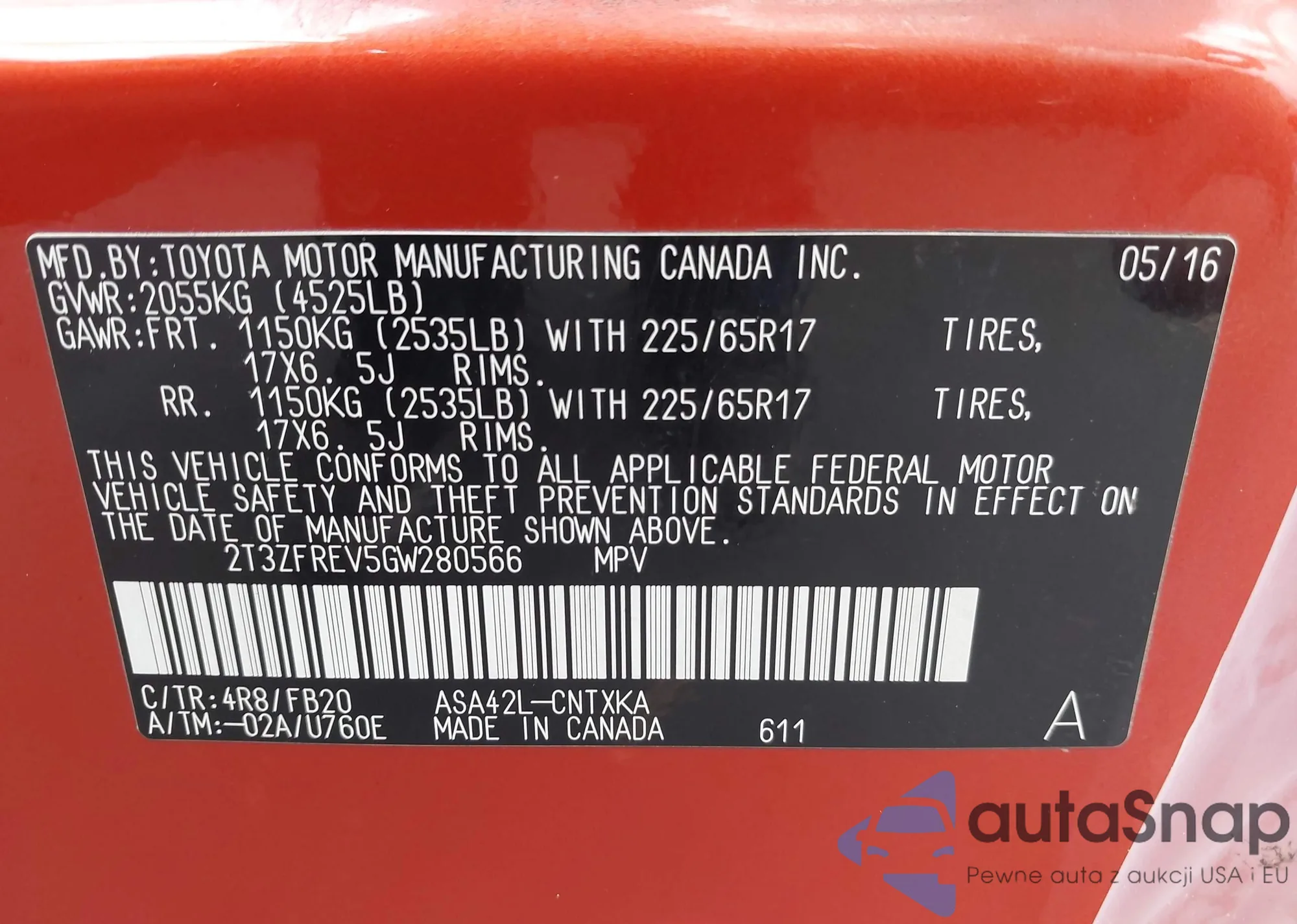 • VIN: 2T3ZFREV5GW280566