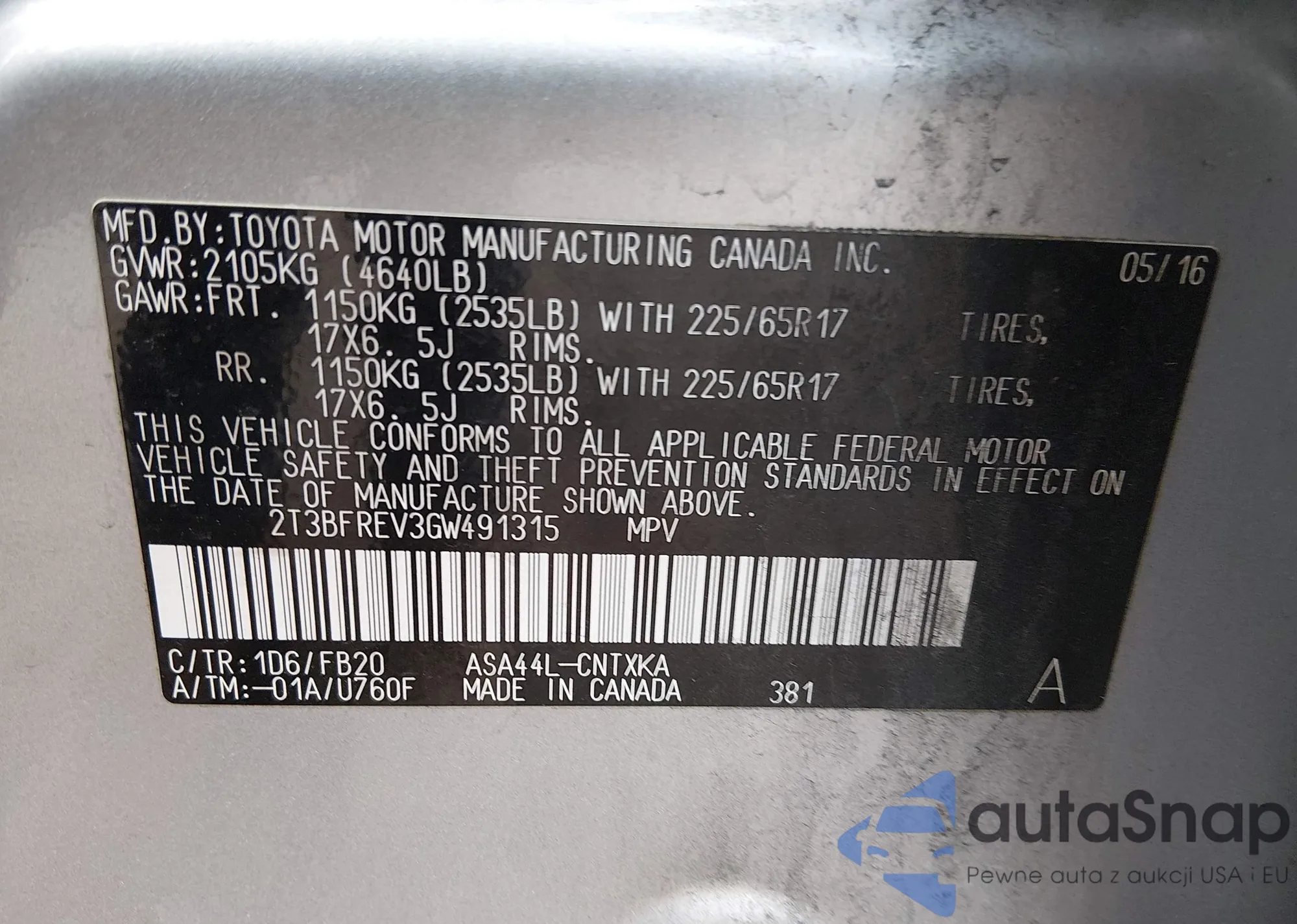 The car Toyota RAV 4 2016 (VIN 2T3BFREV3GW491315) has not been auctioned before. The documents are clean, and the mileage matches or is below the market average. Sold by an insurance company – we recommend purchase. Delivery to the port will take approx. 6–8 weeks.