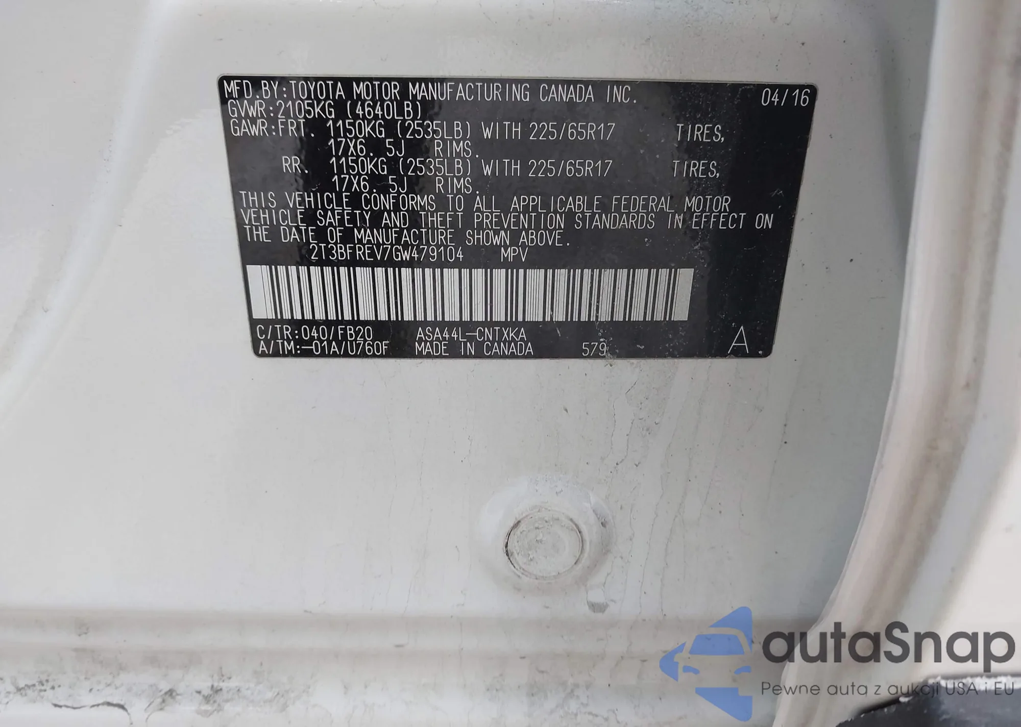 The car Toyota RAV 4 2016 (VIN 2T3BFREV7GW479104) has not been auctioned before. The documents are clean, and the mileage matches or is below the market average. Sold by an insurance company – we recommend purchase. Delivery to the port will take approx. 6–8 weeks.