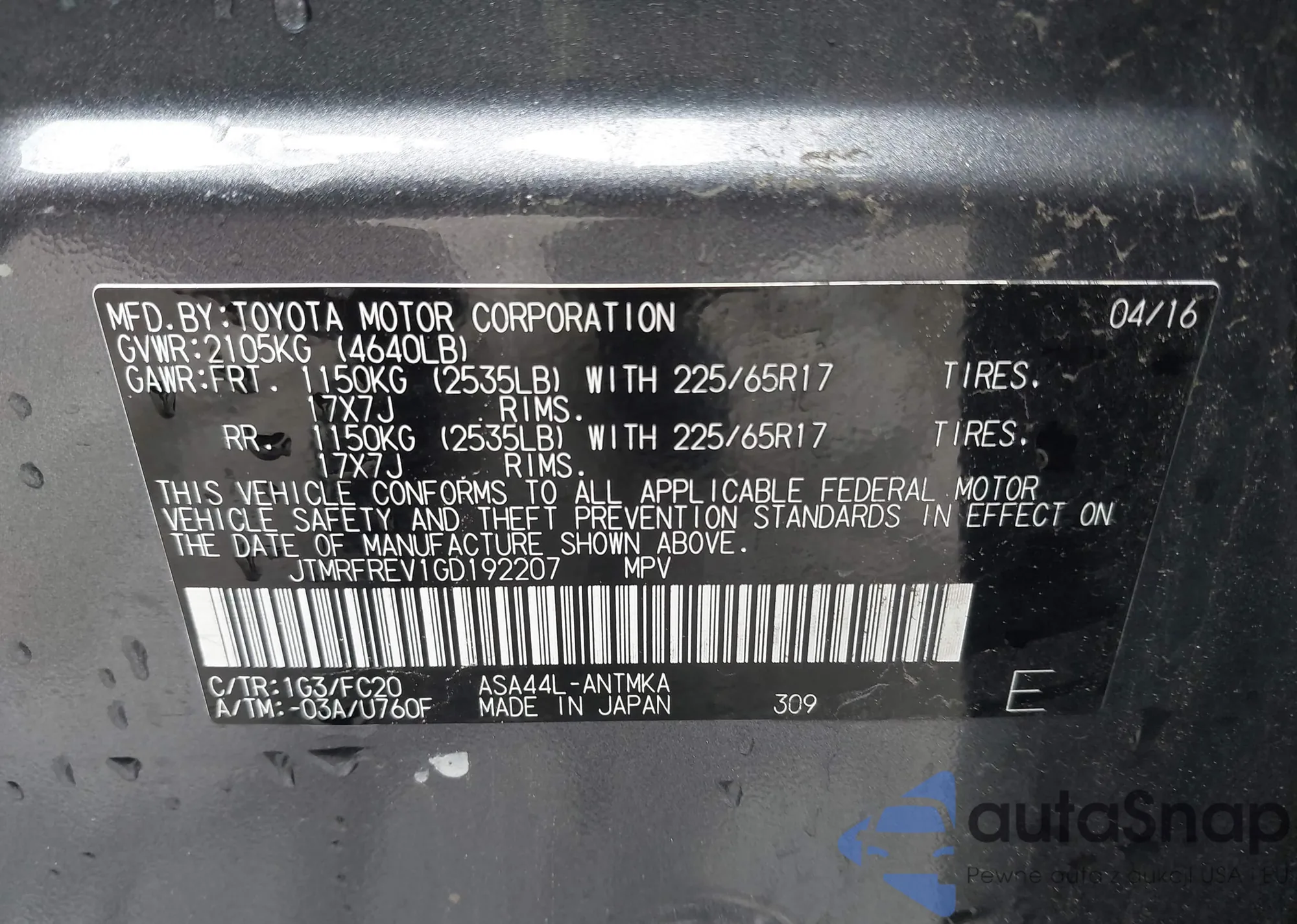 VIN: JTMRFREV1GD192207