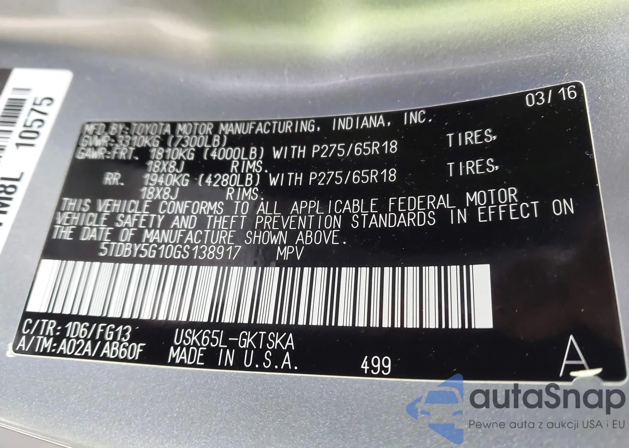 • VIN: 5TDBY5G10GS138917