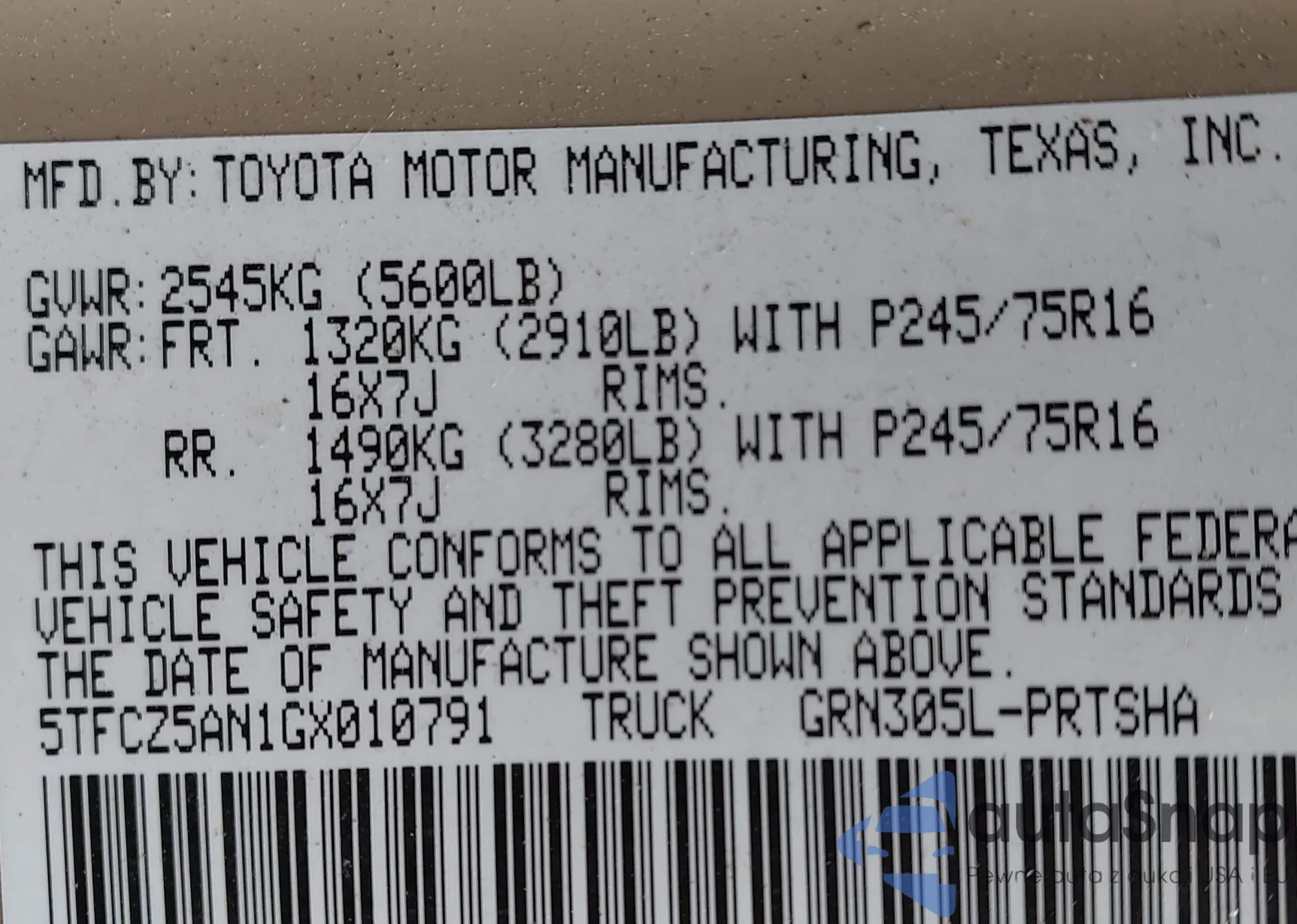 VIN: 5TFCZ5AN1GX010791