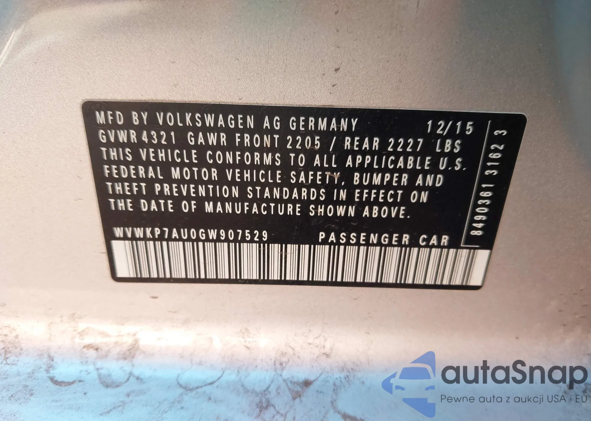 VIN: WVWKP7AU0GW907529