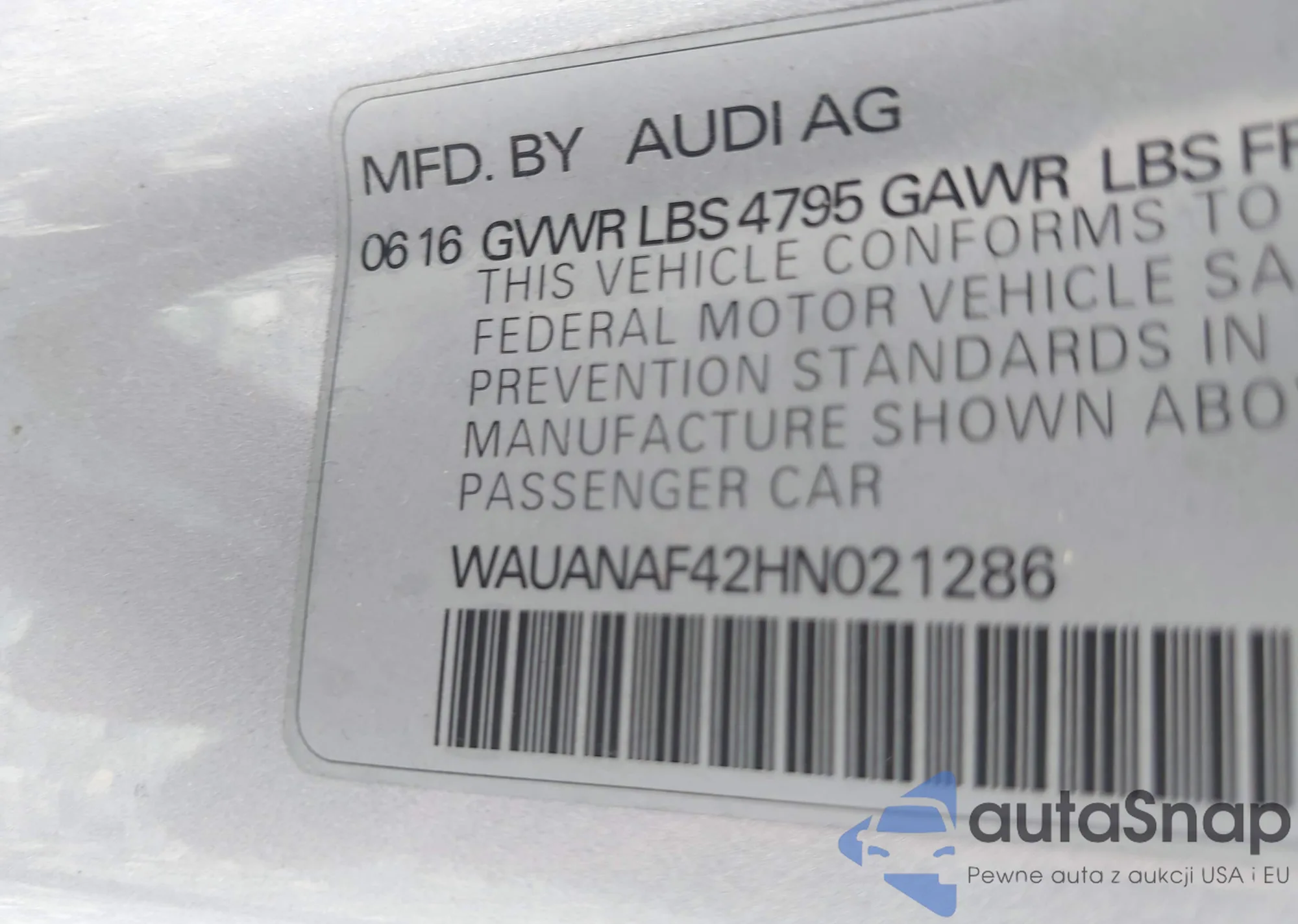 The car Audi A4 2017 (VIN WAUANAF42HN021286) has not been auctioned before. The documents are clean, and the mileage matches or is below the market average. Sold by an insurance company – we recommend purchase. Delivery to the port will take approx. 6–8 weeks.