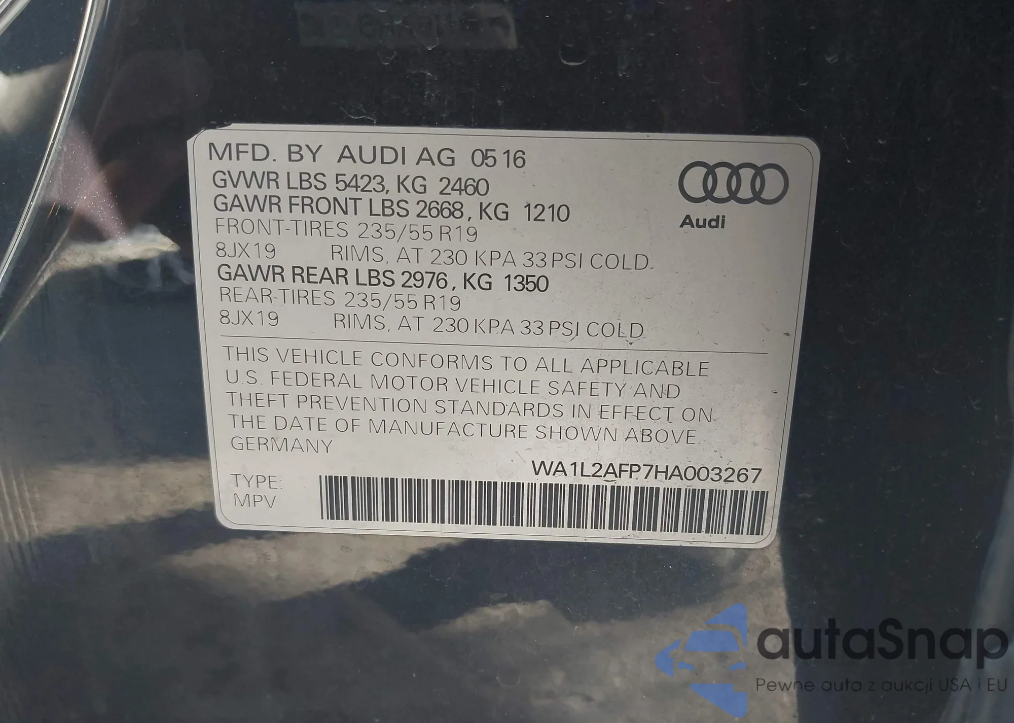 The car Audi Q5 2017 (VIN WA1L2AFP7HA003267) has not been auctioned before. The documents are clean, and the mileage matches or is below the market average. Sold by an insurance company – we recommend purchase. Delivery to the port will take approx. 6–8 weeks.