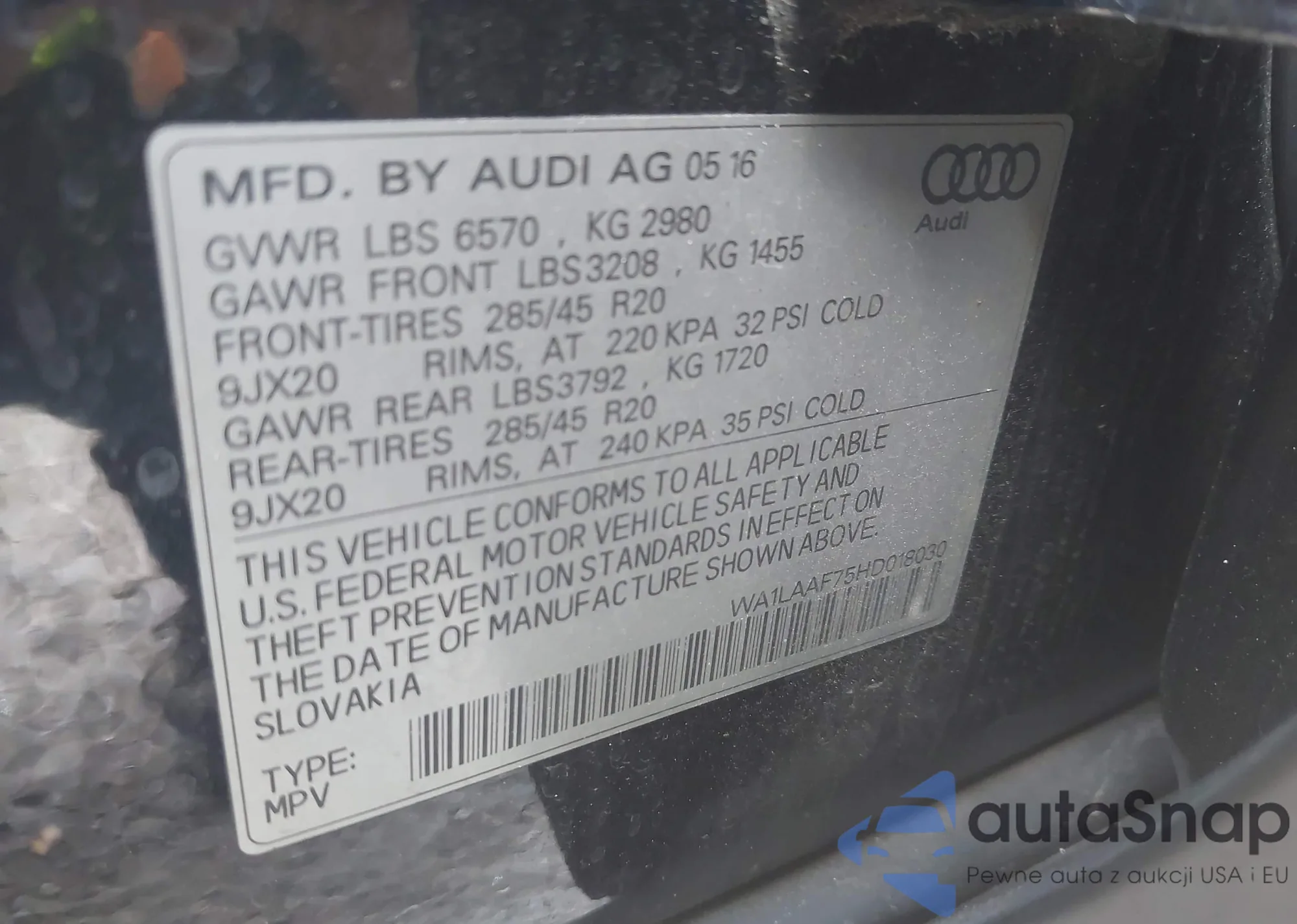 • VIN: WA1LAAF75HD018030