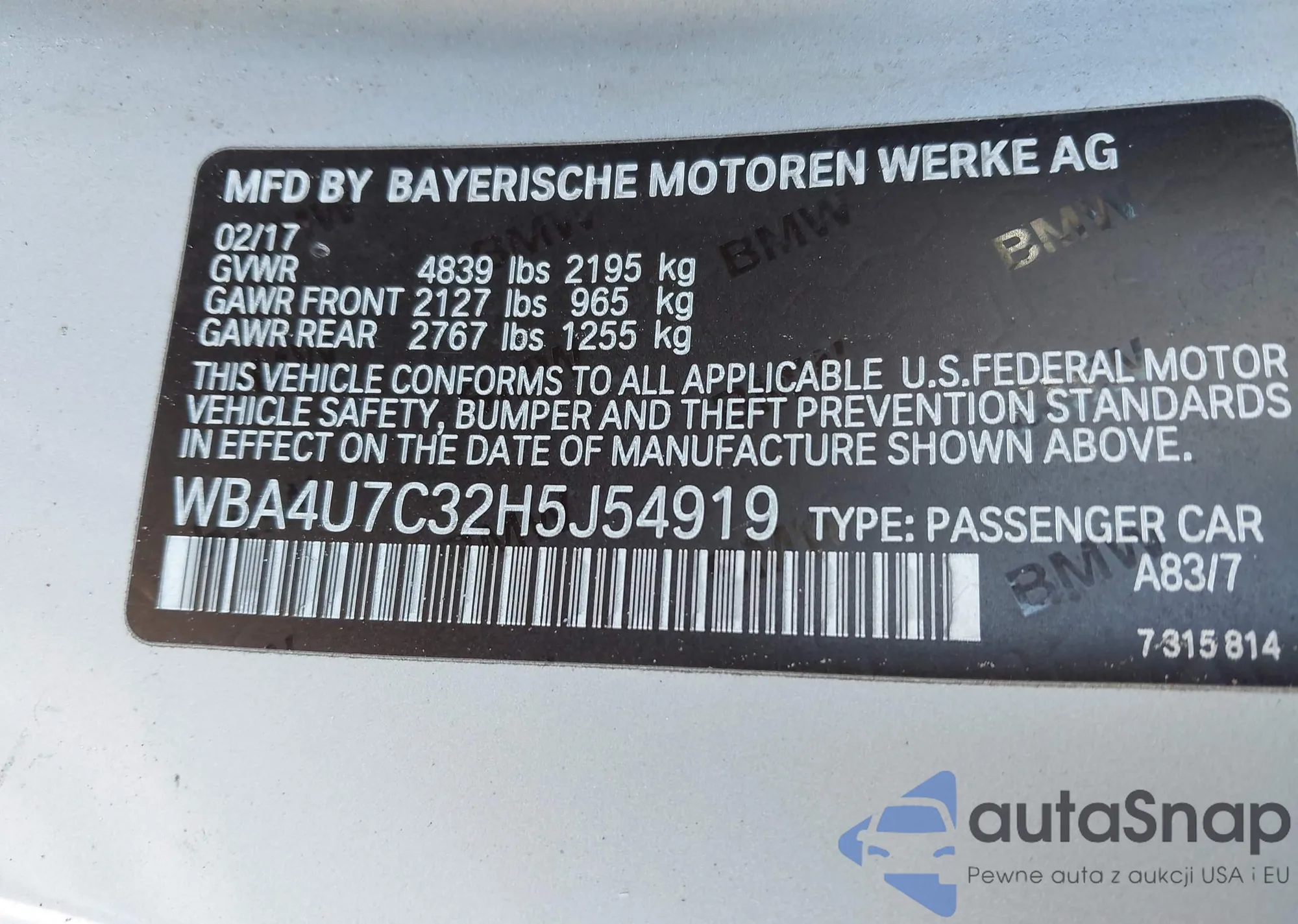 VIN: WBA4U7C32H5J54919