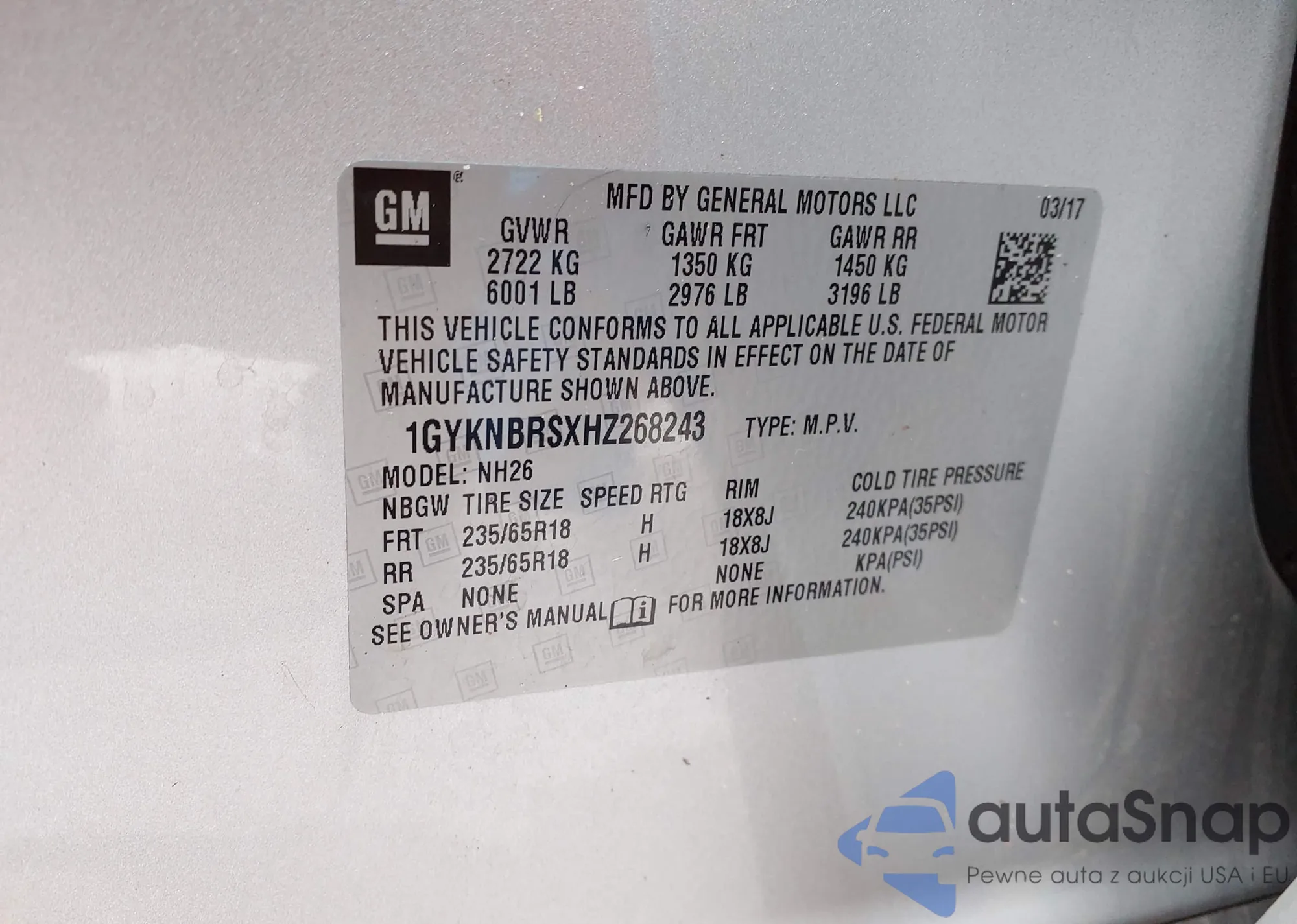 VIN: 1GYKNBRSXHZ268243