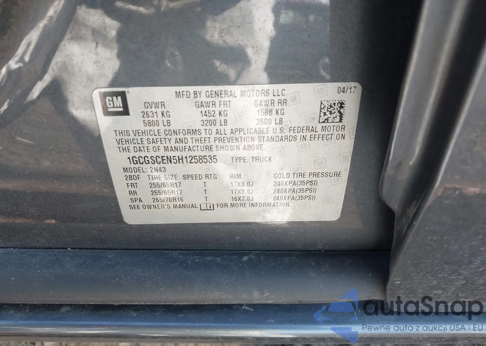 The car Chevrolet Colorado 2017 (VIN 1GCGSCEN5H1258535) has not been auctioned before. The documents are clean, and the mileage matches or is below the market average. Sold by an insurance company – we recommend purchase. Delivery to the port will take approx. 6–8 weeks.