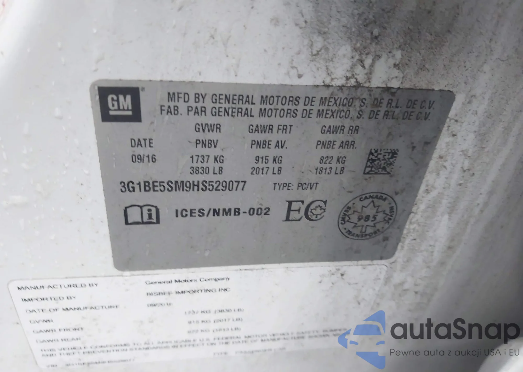 VIN: 3G1BE5SM9HS529077