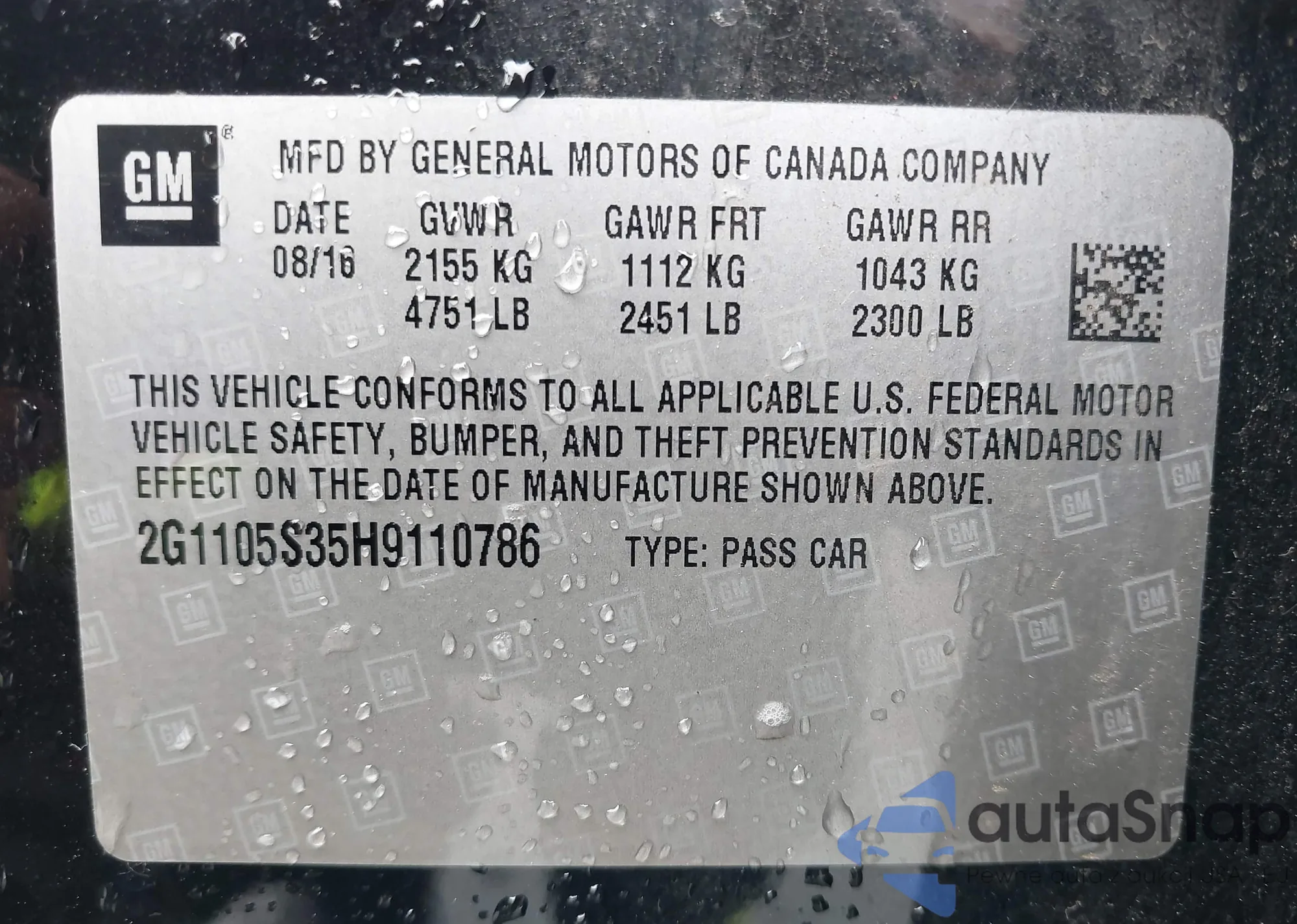 • VIN: 2G1105S35H9110786